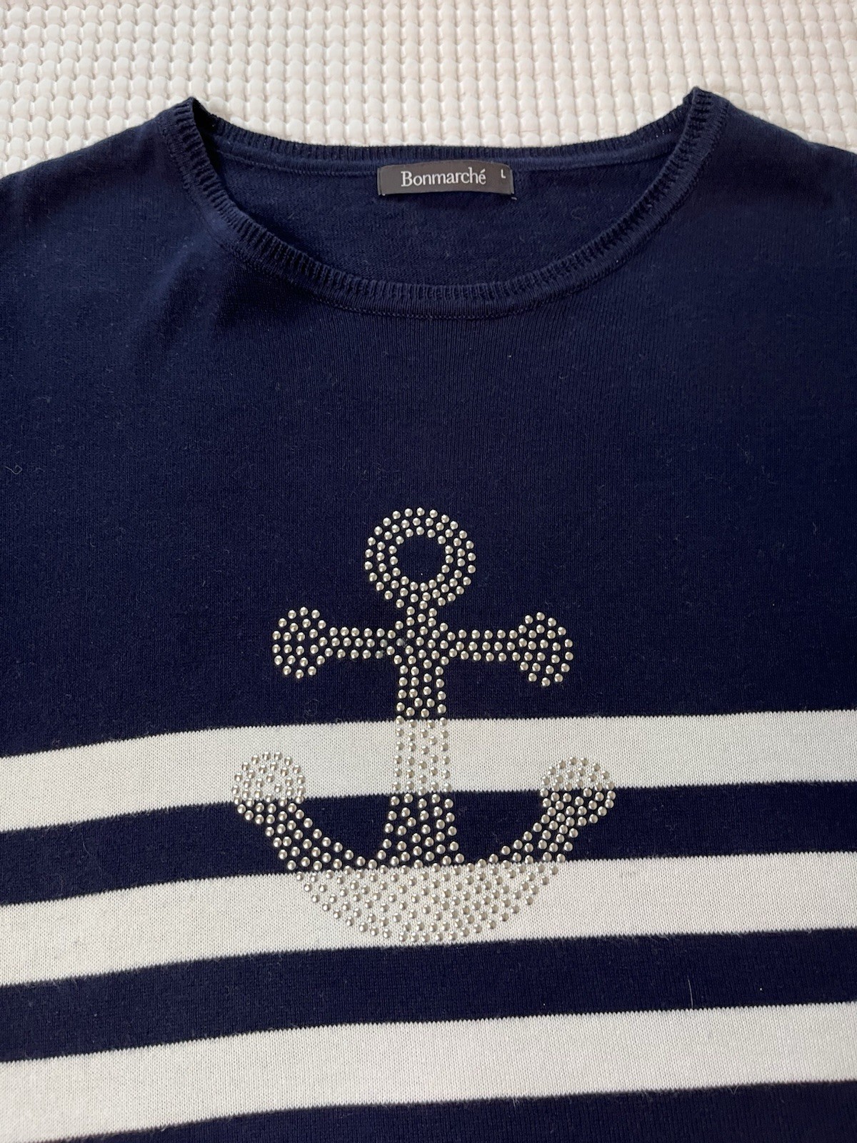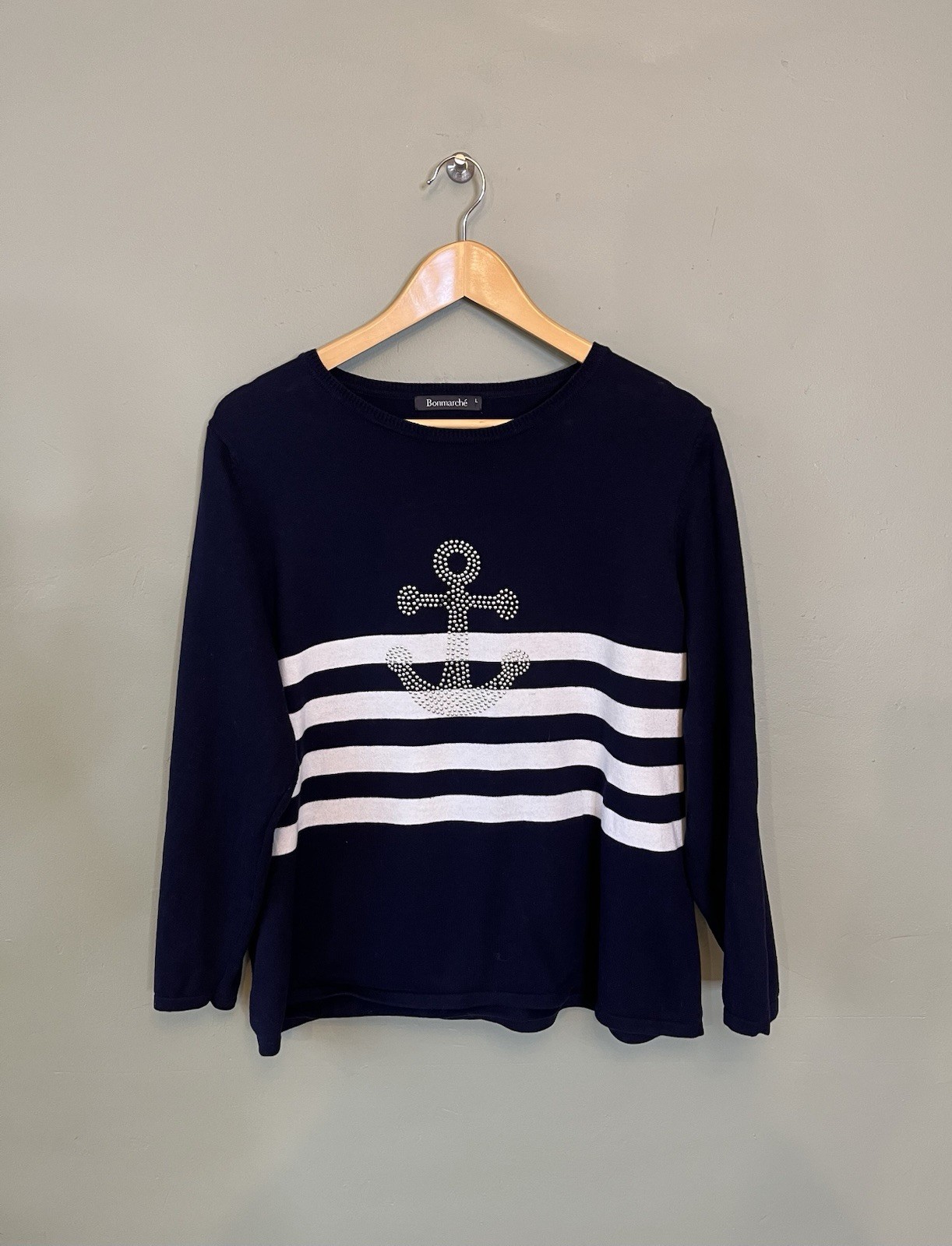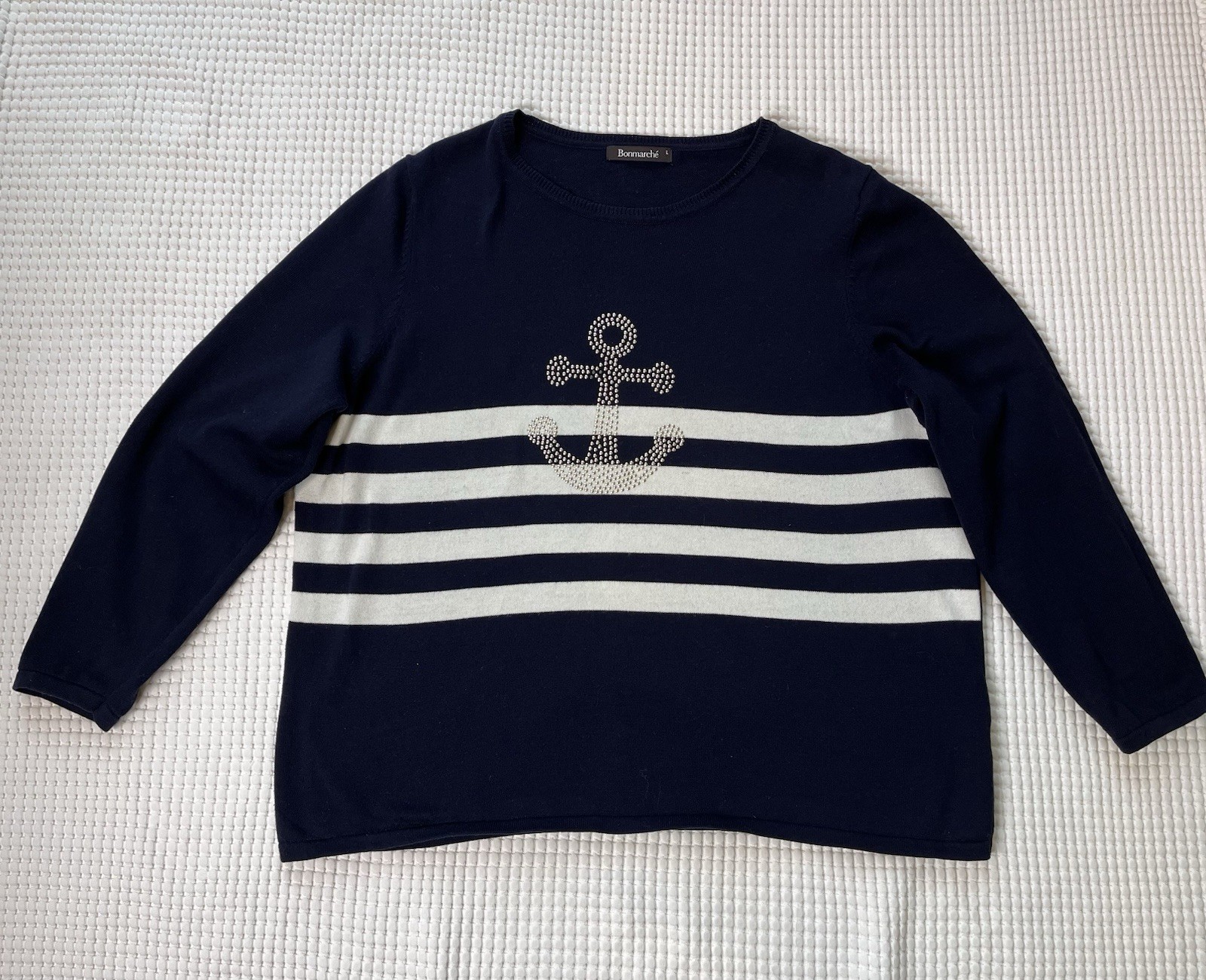 Bon March Ladies Jumper Sweater Size L UK 16-18 Navy Blue Nautical 100 Cotton
