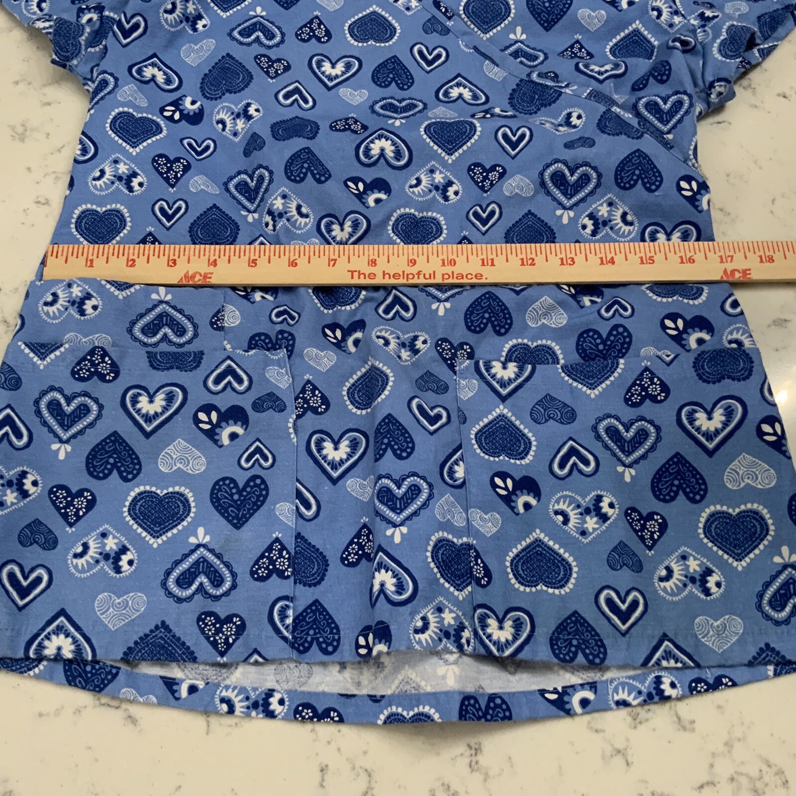 как выглядит B Scrubs Blue Heart Print Scrub Top Cinched Elastic Back Size Small Side Slits фото