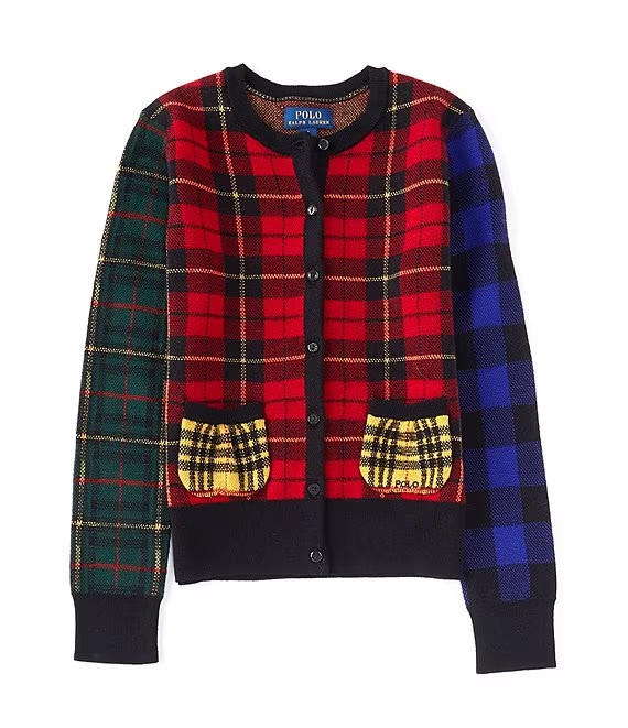 NWT Polo Ralph Lauren 175 Black MULTI-PLAID Wool Cardigan Sweater Girls L 12/14