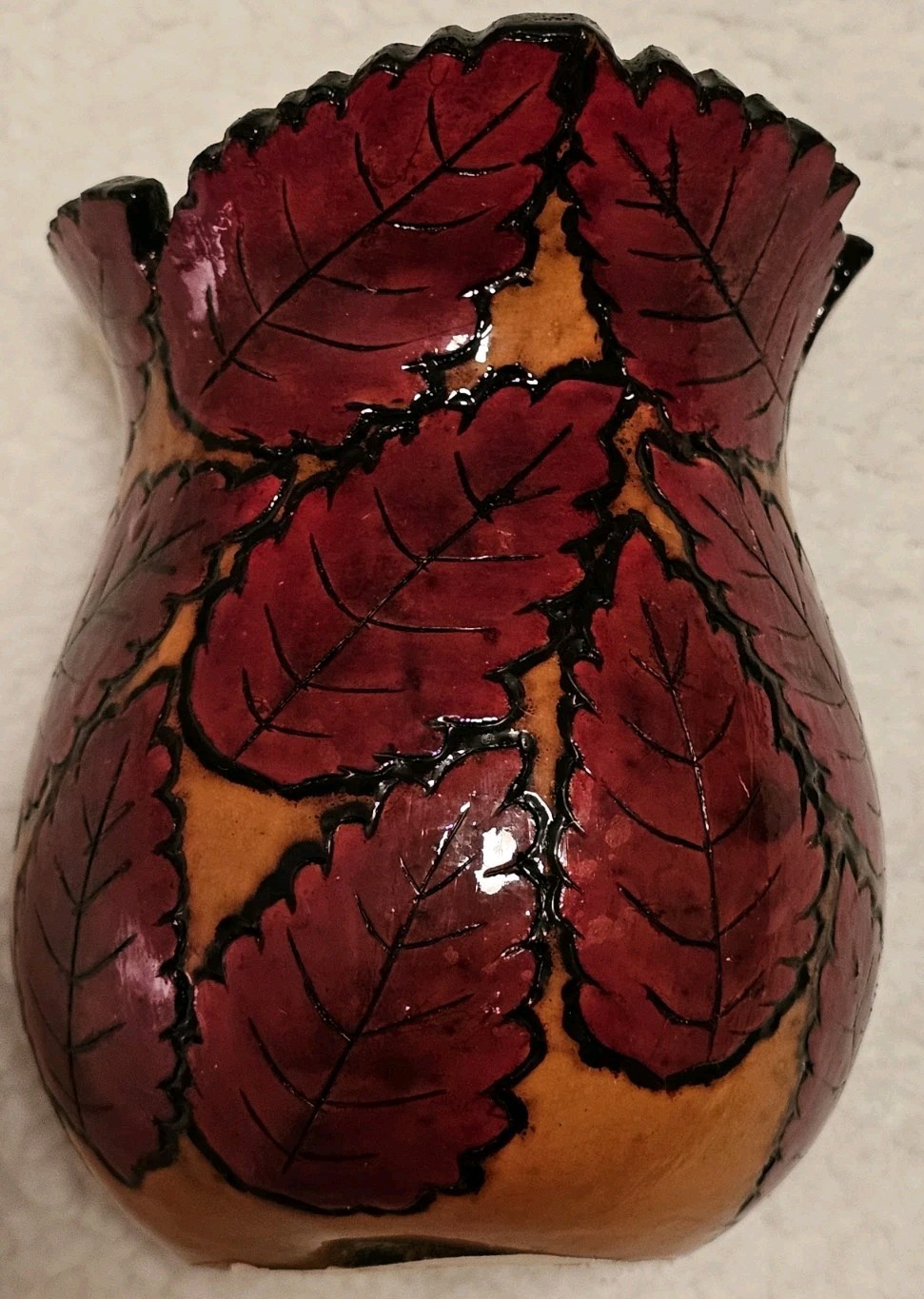 как выглядит Hand carved Autumn Leaves Design Gourd Vase Artist W McCart One Of A Kind фото