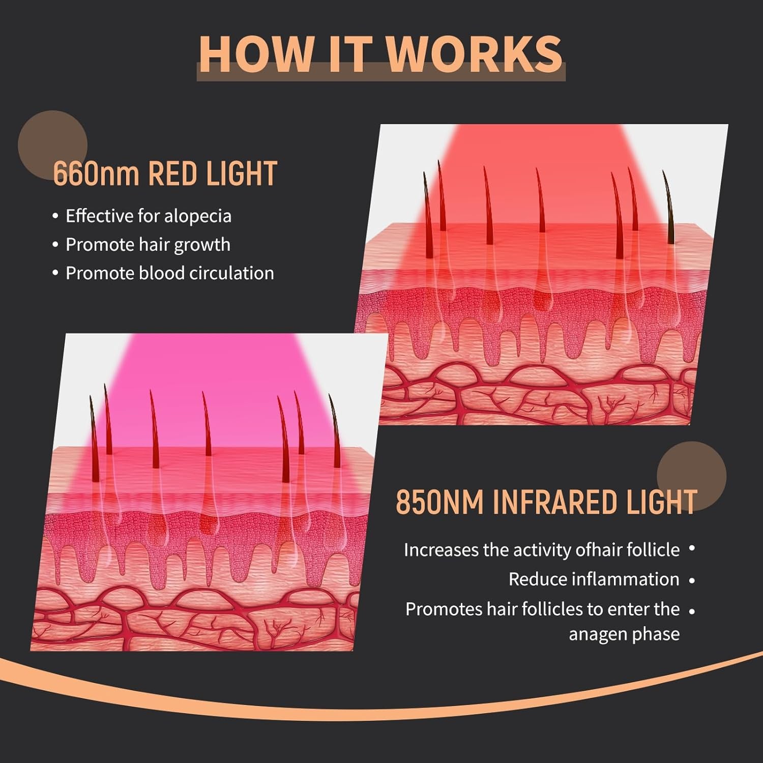 Dual Wavelength: Our laser cap combines 660nm & 850nm lasers. 660nm reactive hair