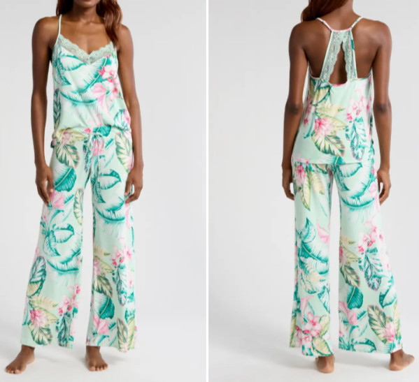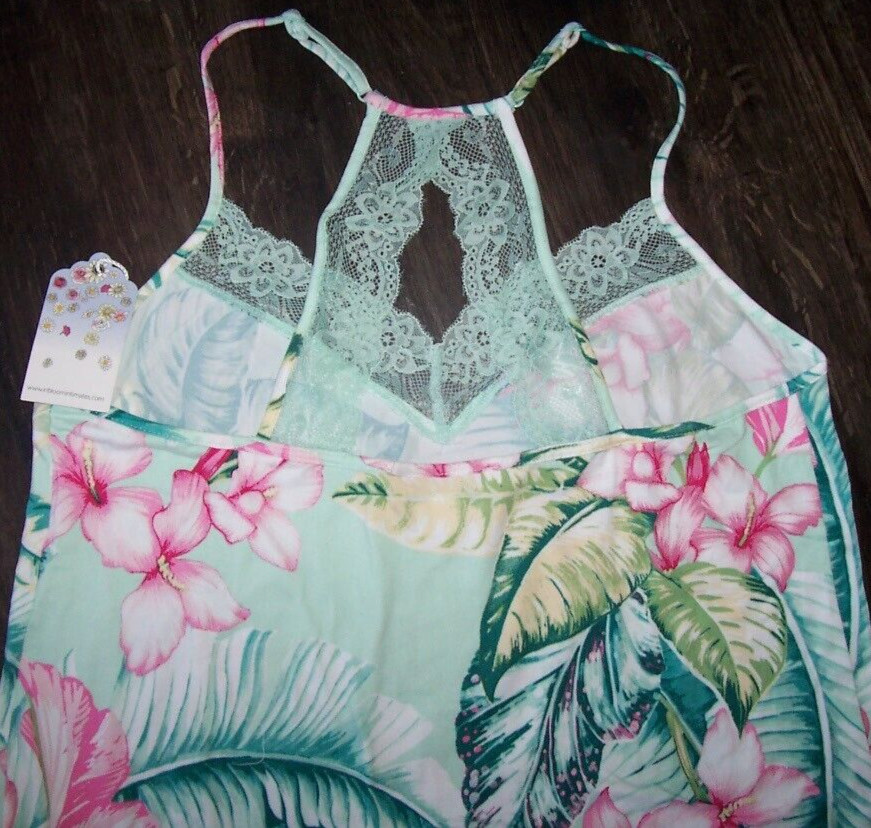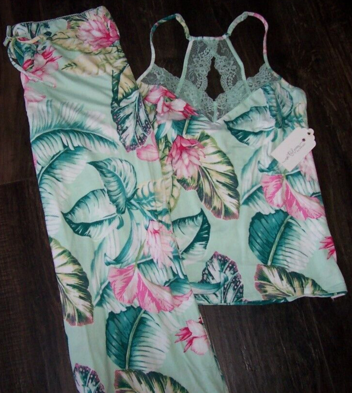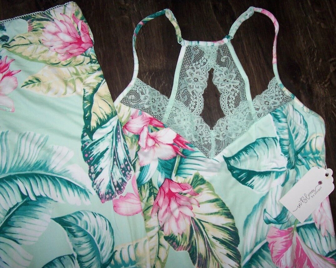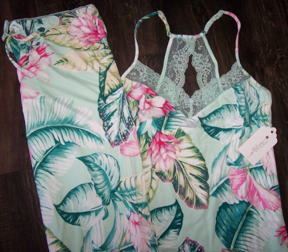 NWT In Bloom by Jonquil Celadon GREEN/PINK FLORAL Knit Pajama Set XL LACE Trim
