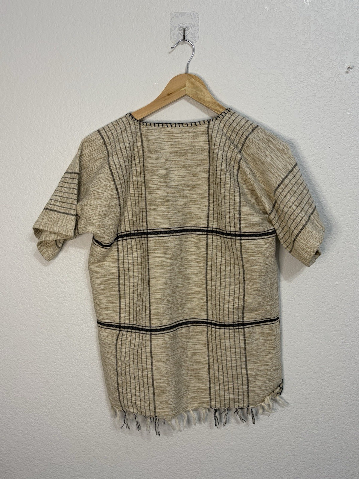 Vintage Handmade Dashiki Hakuna Matata Shirt Beige Short Sleeve Fringed Hem S