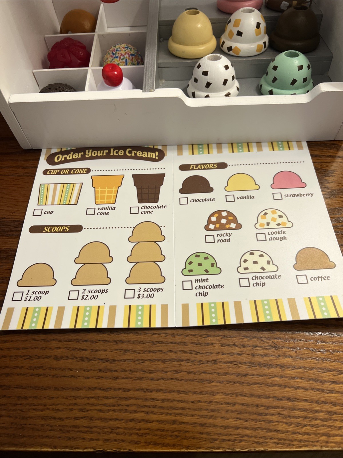 Melissa Doug Wooden Scoop and Serve Ice Cream Counter 16 Pcs Play Food Wood