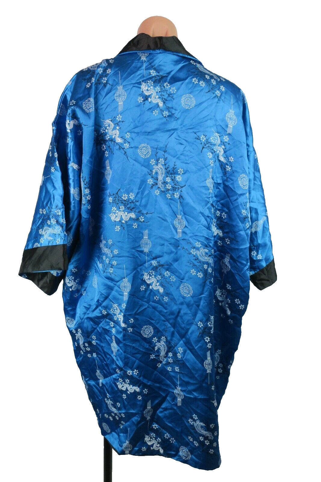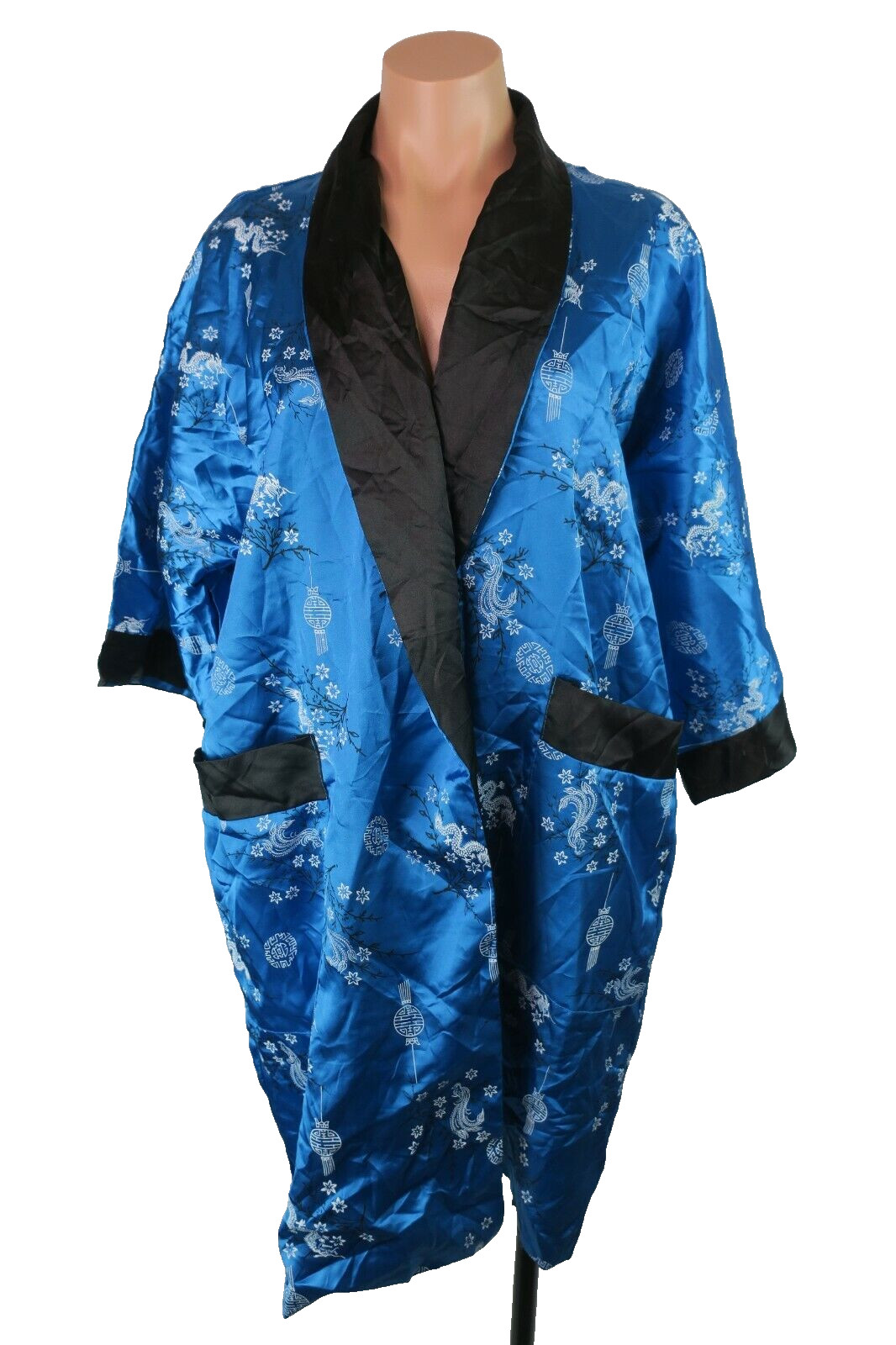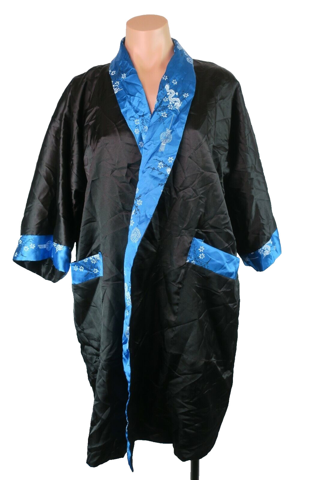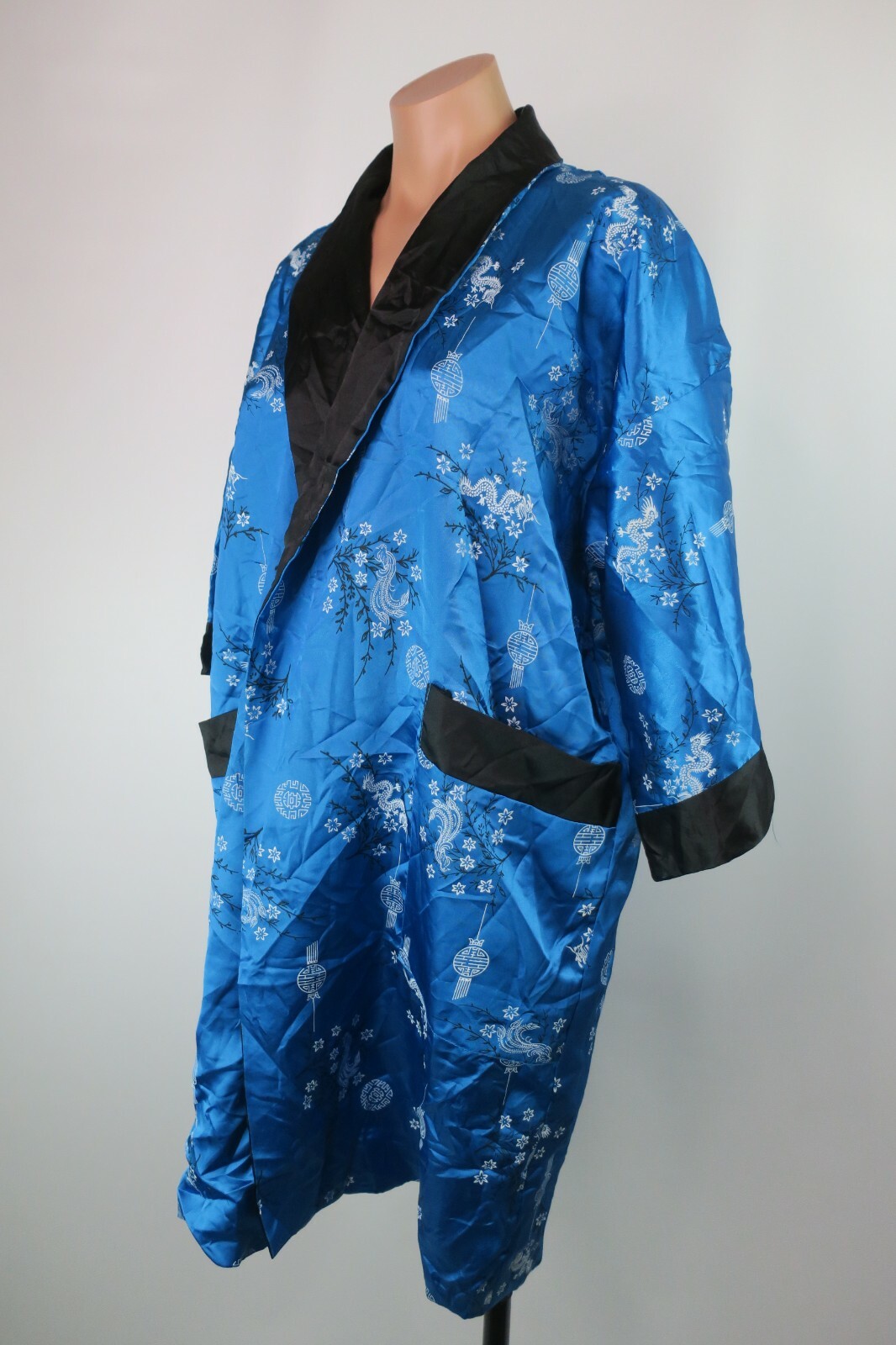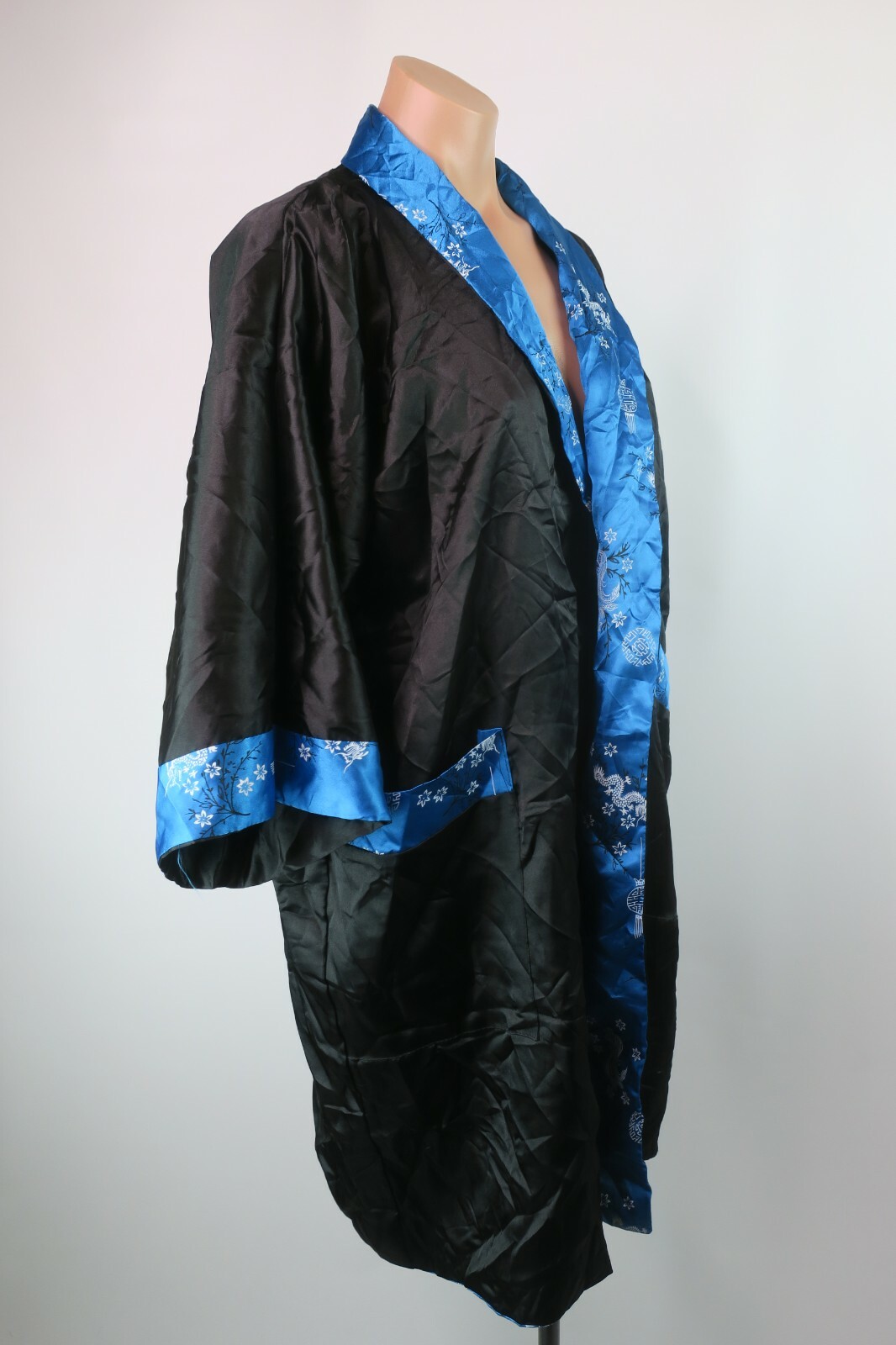 как выглядит VTG Asian Long Reversible Robe Embroidered Dragons Kimono Blue Coverup 70s Sz M фото