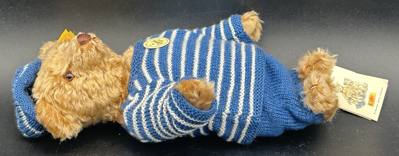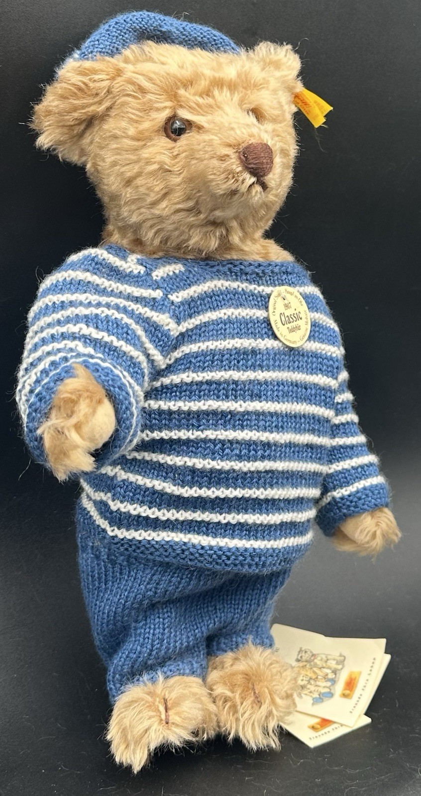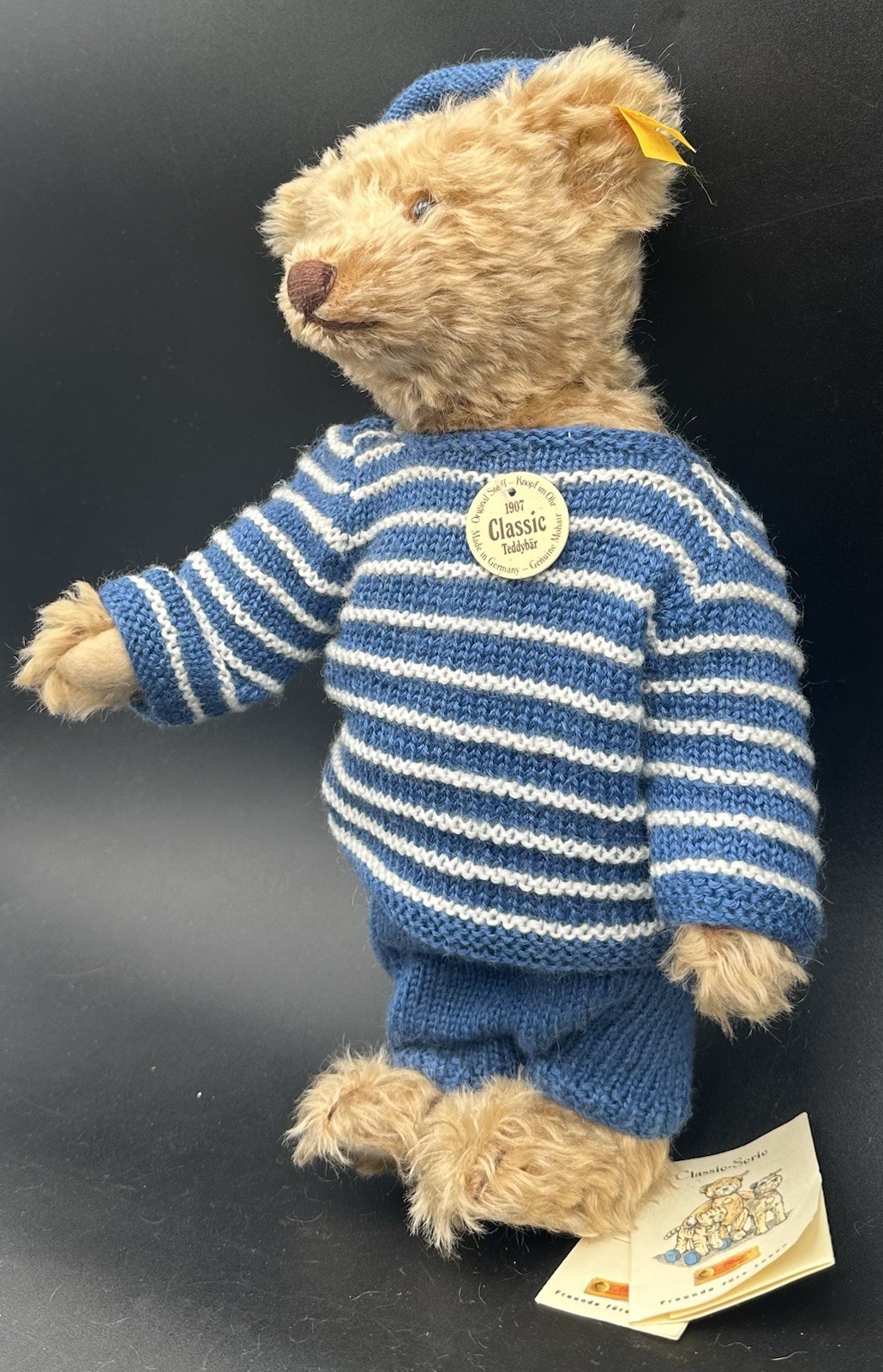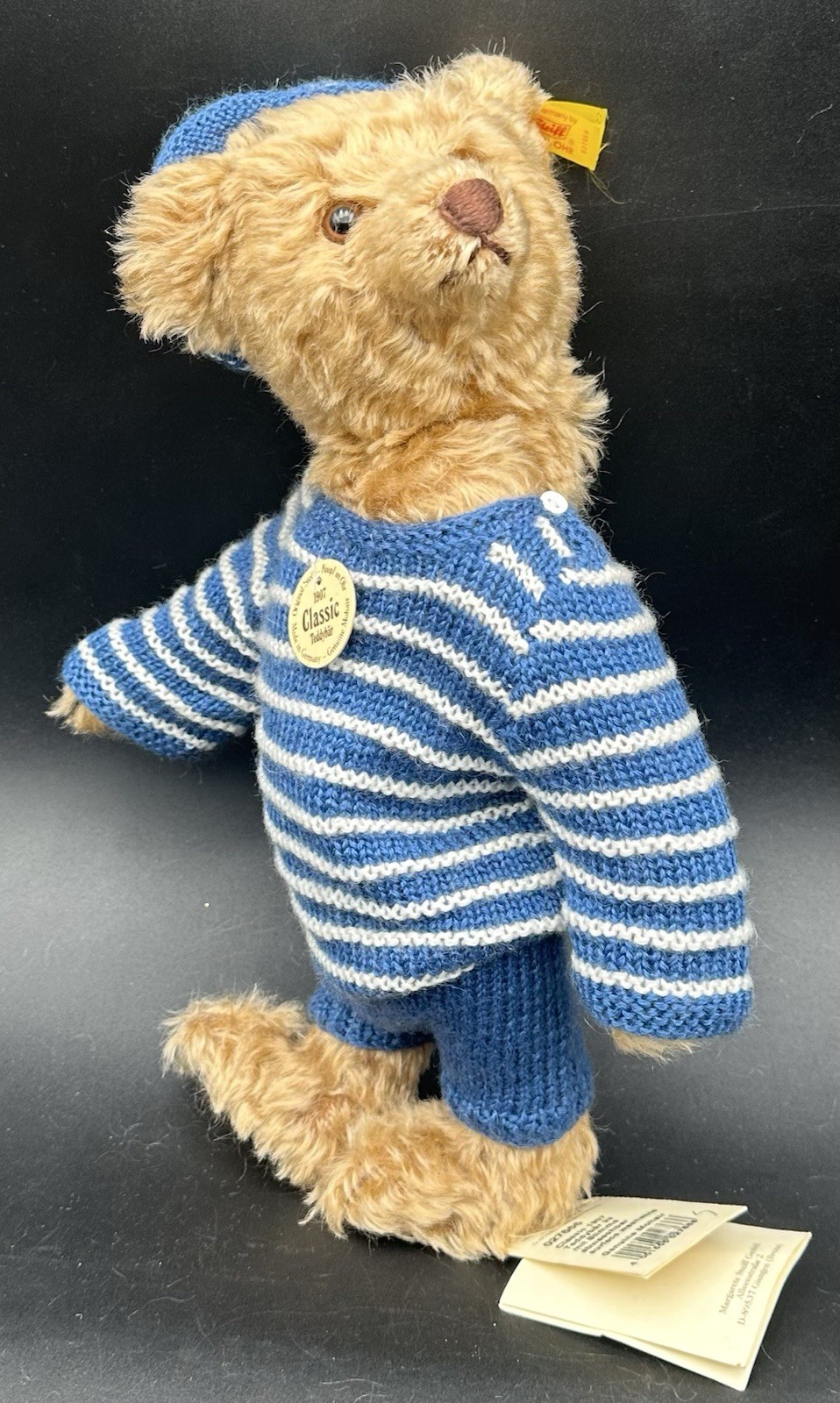 как выглядит Steiff Classic 1907 Teddy Bear Replica ID Button Tag Growler Mohair Blue Striped фото