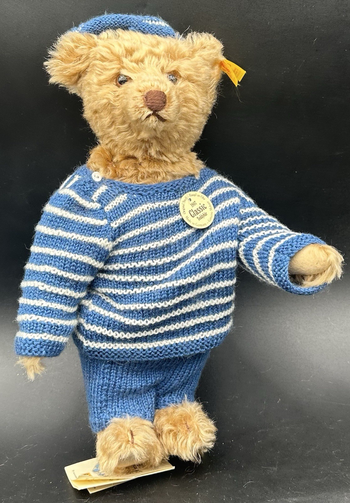 Steiff Classic 1907 Teddy Bear Replica ID Button Tag Growler Mohair Blue Striped