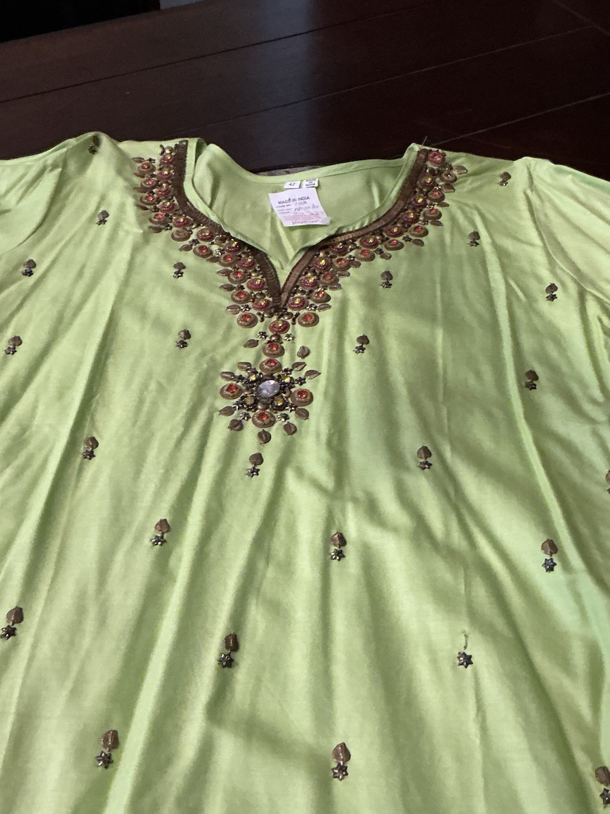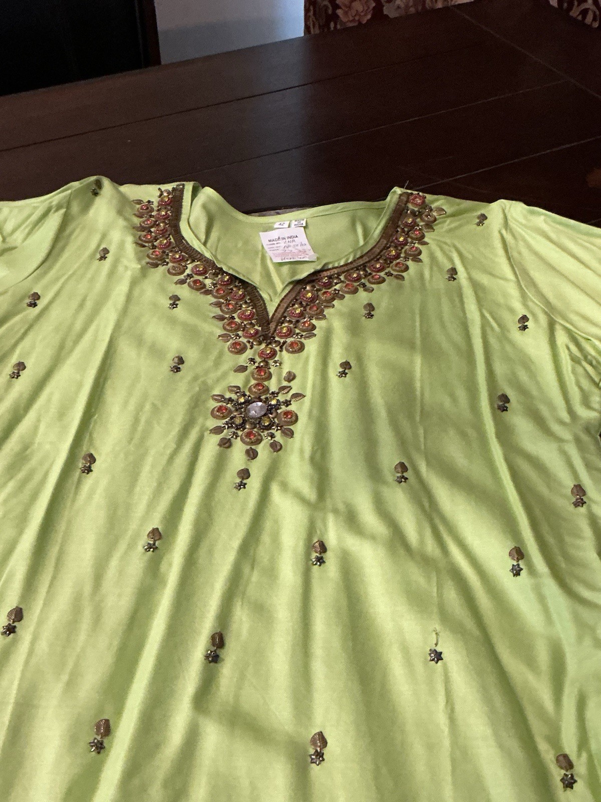 Green Sequined Cotton Blend Kurta Kurti Top, Long Sleeve,30 Long, 42 Bust, New