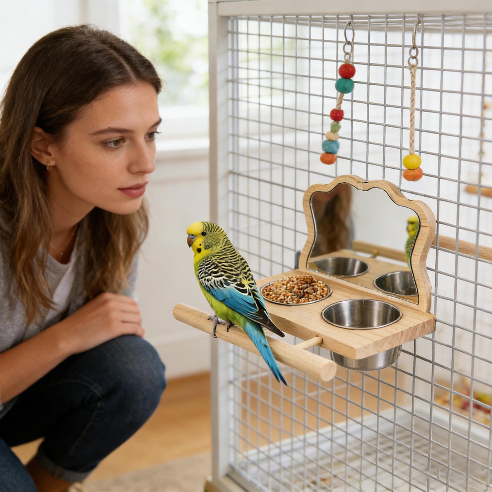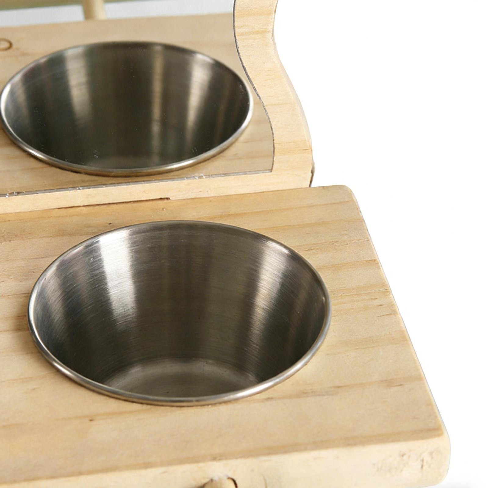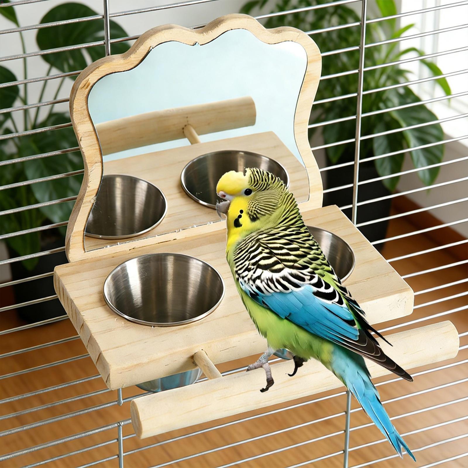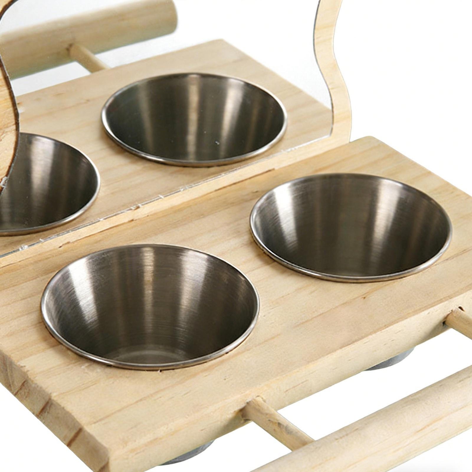 Bird Mirror Parrot Perch with Feeding Cups Parrot Cage Wooden Perch with Mirror