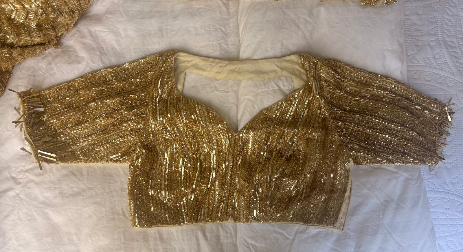 как выглядит Lehenga Choli Gold Net Sequins, Cut Work V-neck Embroidered фото