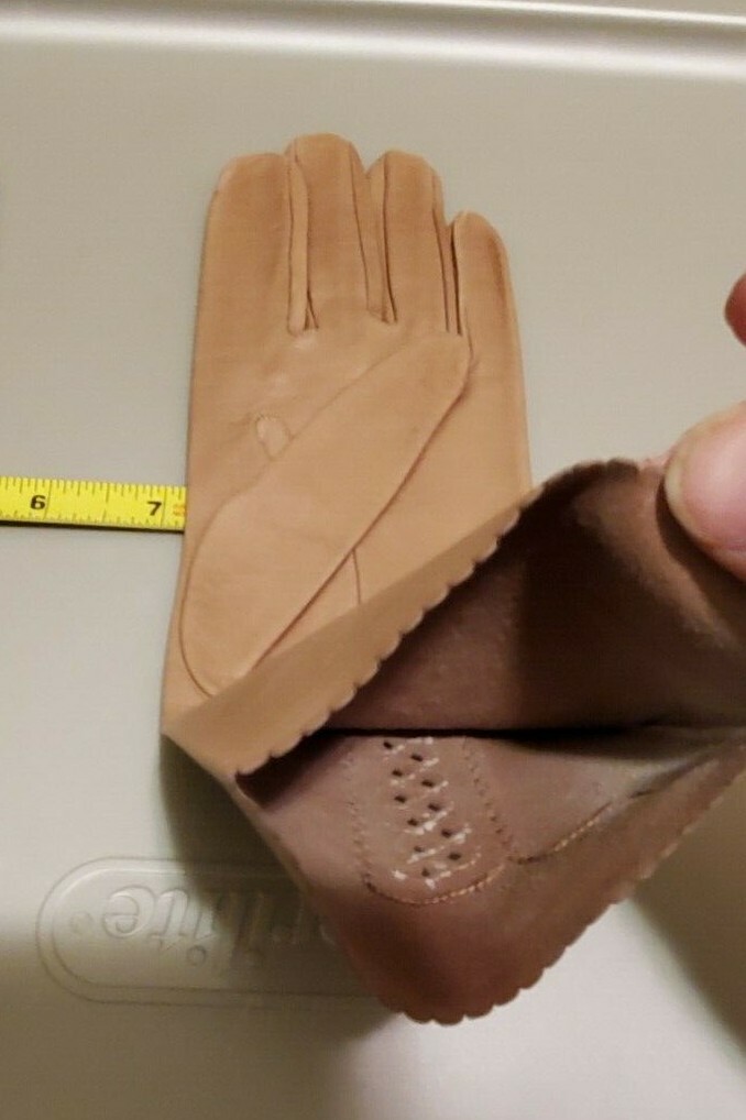 как выглядит Vintage 11" long brown Leather Gloves, size 7 1/2 - with cutouts фото