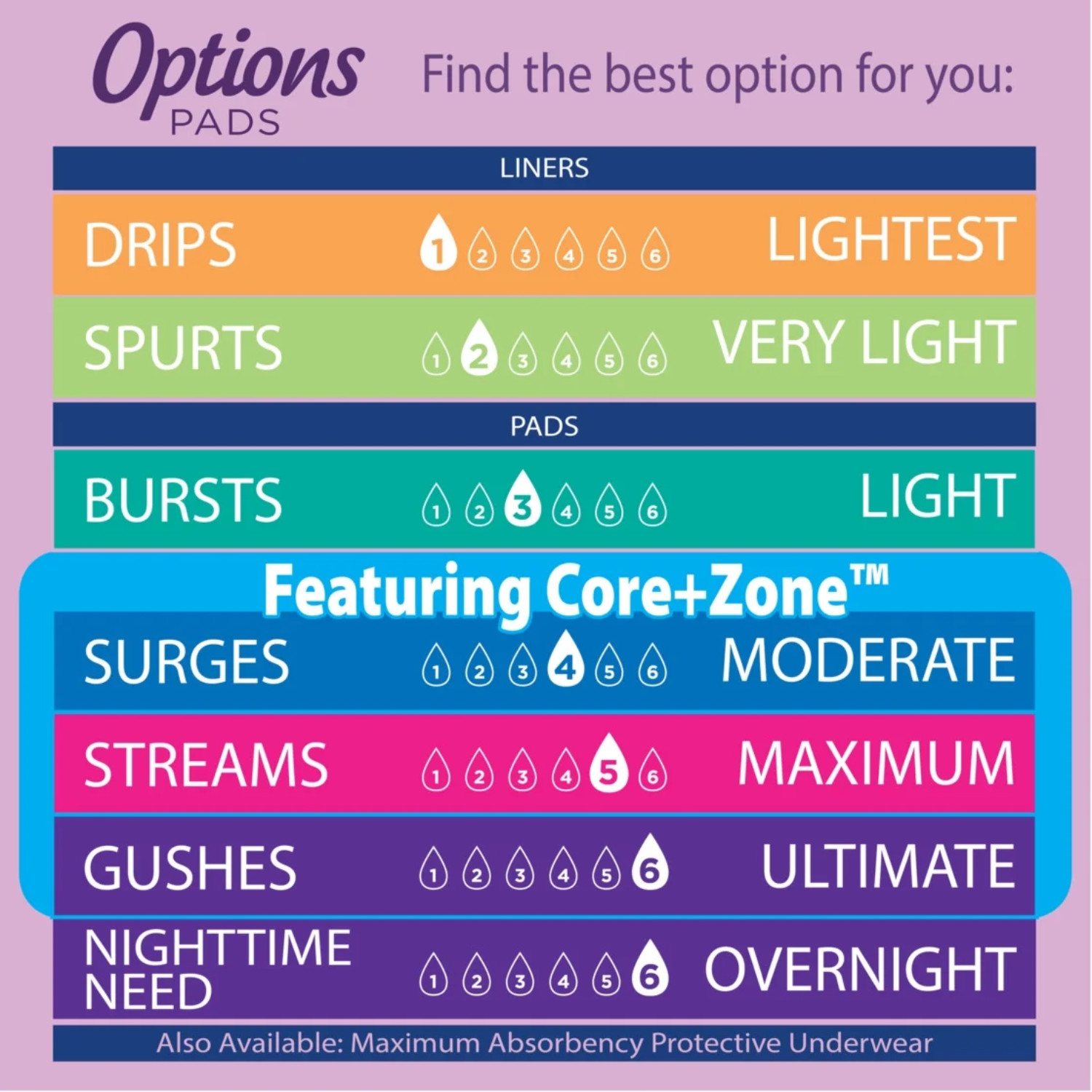 Options Women's Incontinence Pads Extra Coverage, Maximum, Long Length, 72 Count