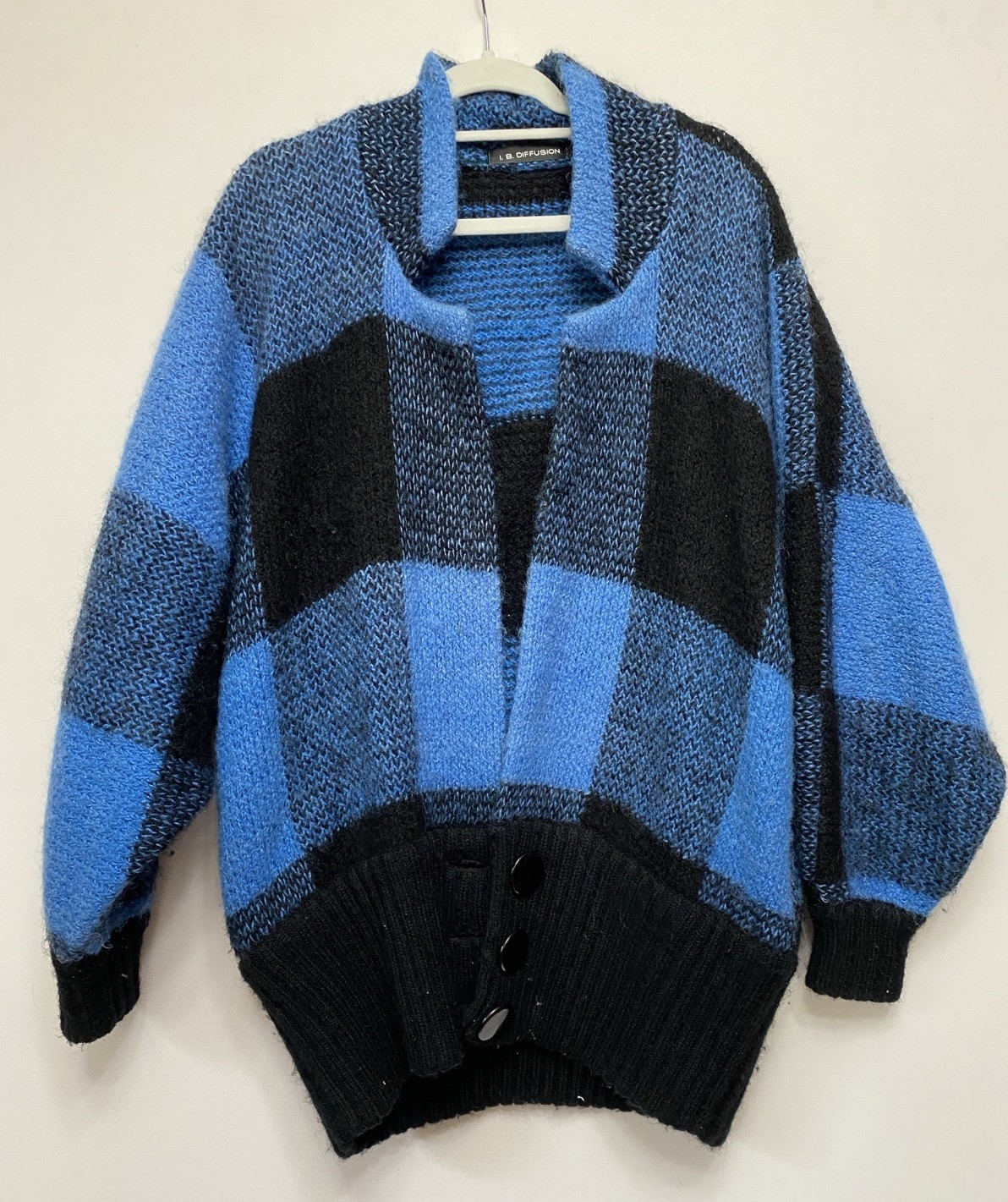 как выглядит Vtg I.B. Diffusion L Mohair Knit Sweater Cardigan Blue Plaid Oversized Jacket фото