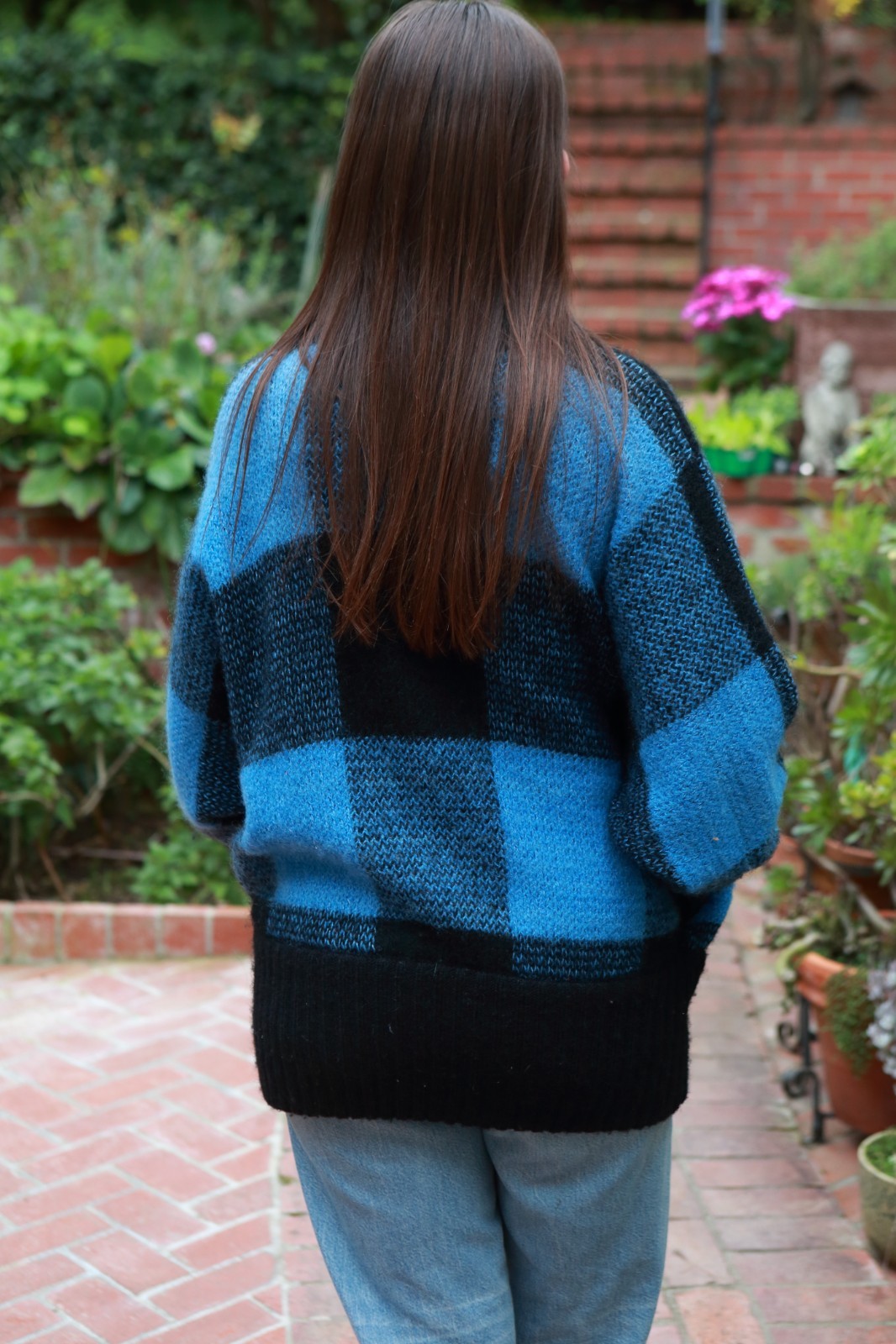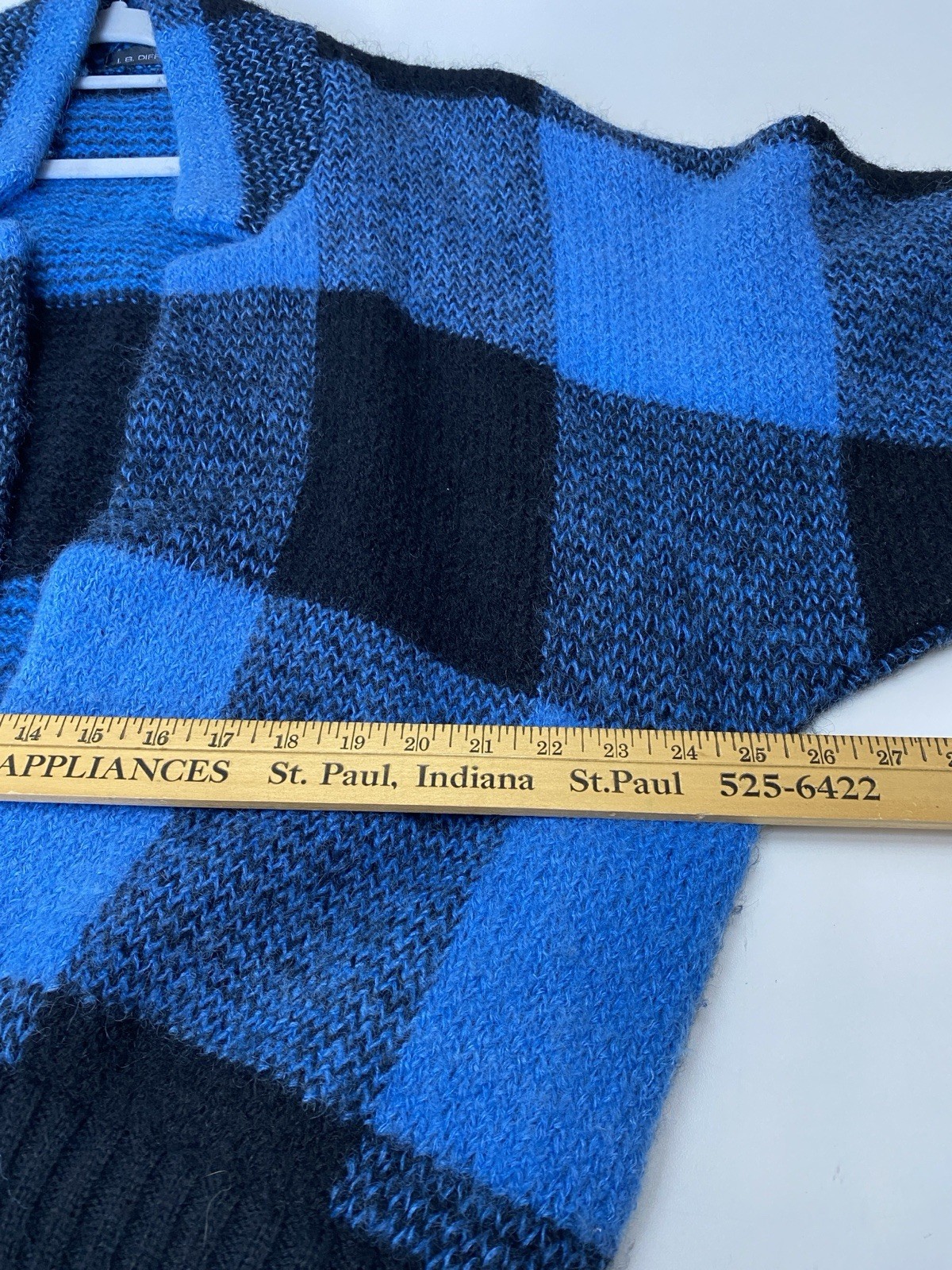 Vtg I.B. Diffusion L Mohair Knit Sweater Cardigan Blue Plaid Oversized Jacket