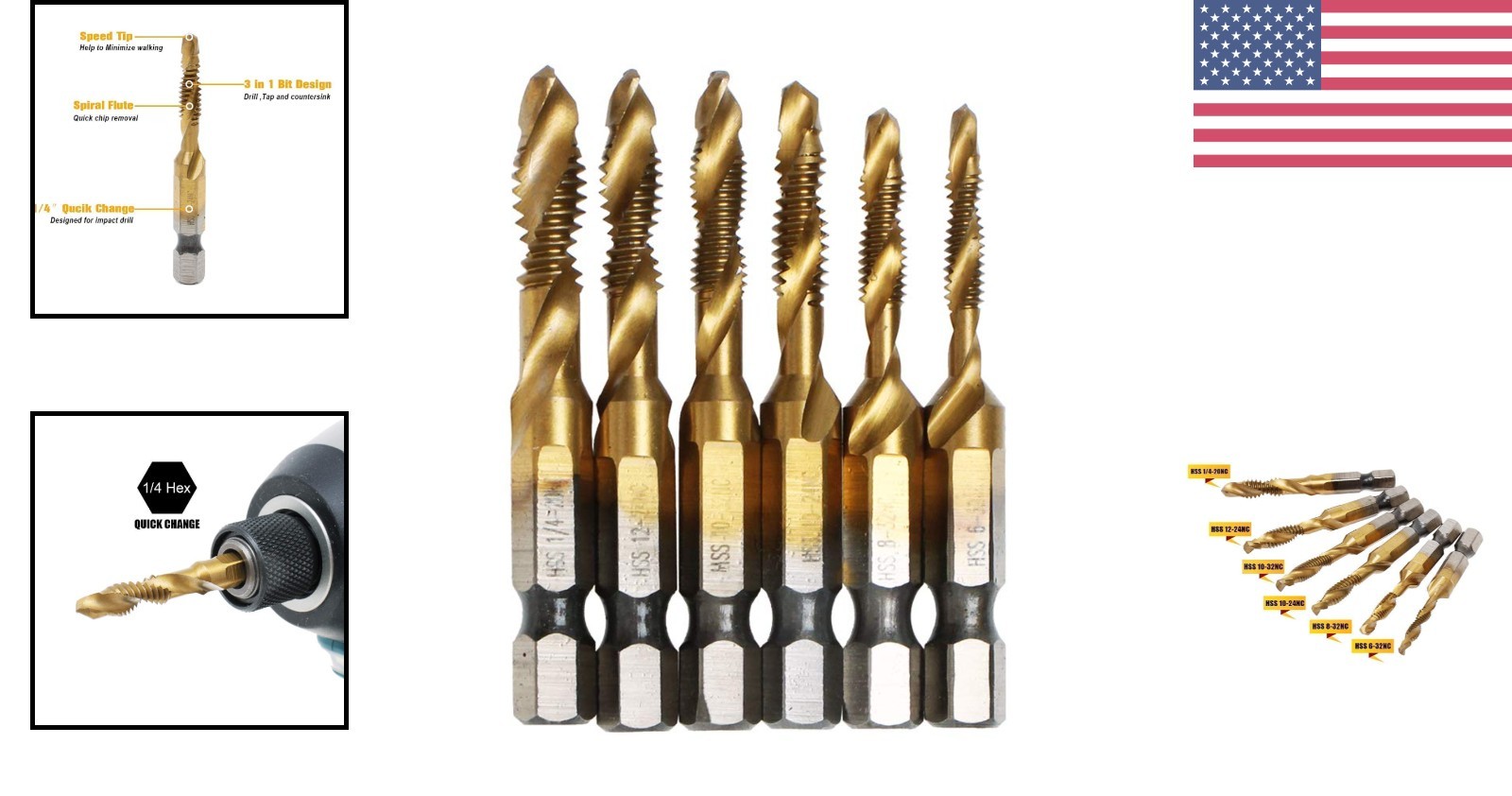 6 Pack Titanium Combination Drill Tap Bit Set Screw Tapping SAE 6-32NC 8-32NC...