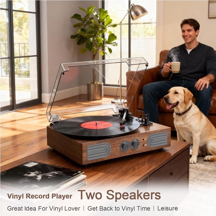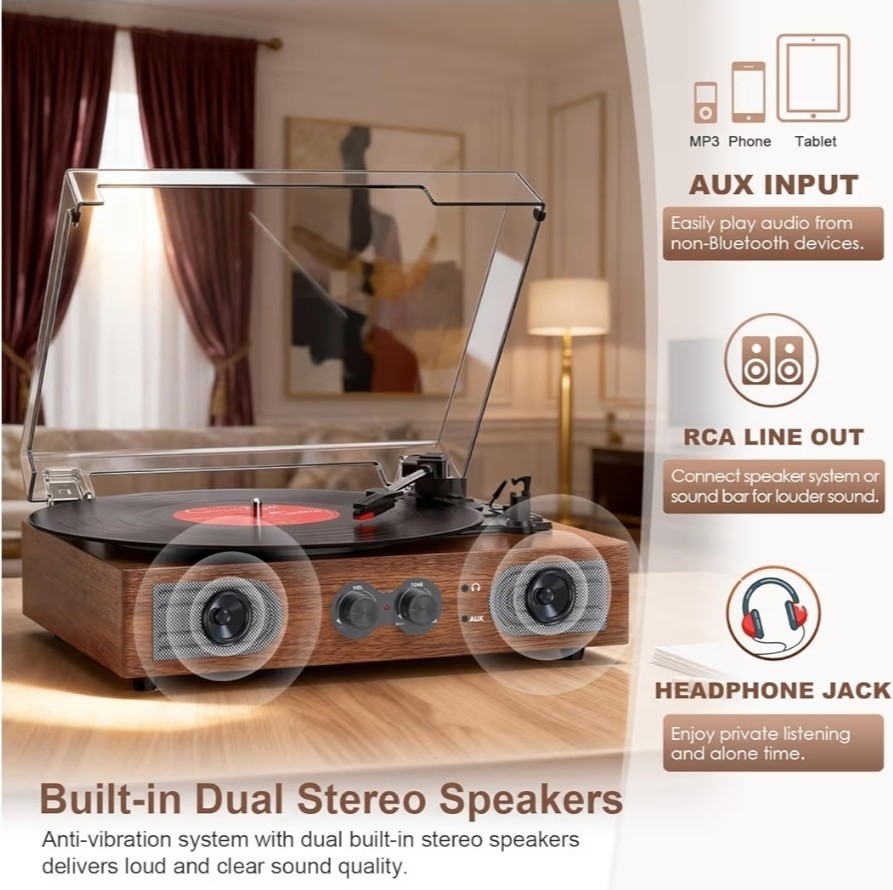 Bluetooth Vintage Vinyl Record Player 3-Speed Turntable Built-in Speakers