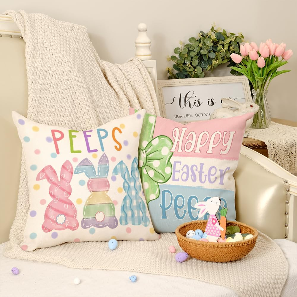 Happy Easter Peeps Pillow Covers 18X18 Inch Set of 4, Striped Bunnies Eggs Chick
