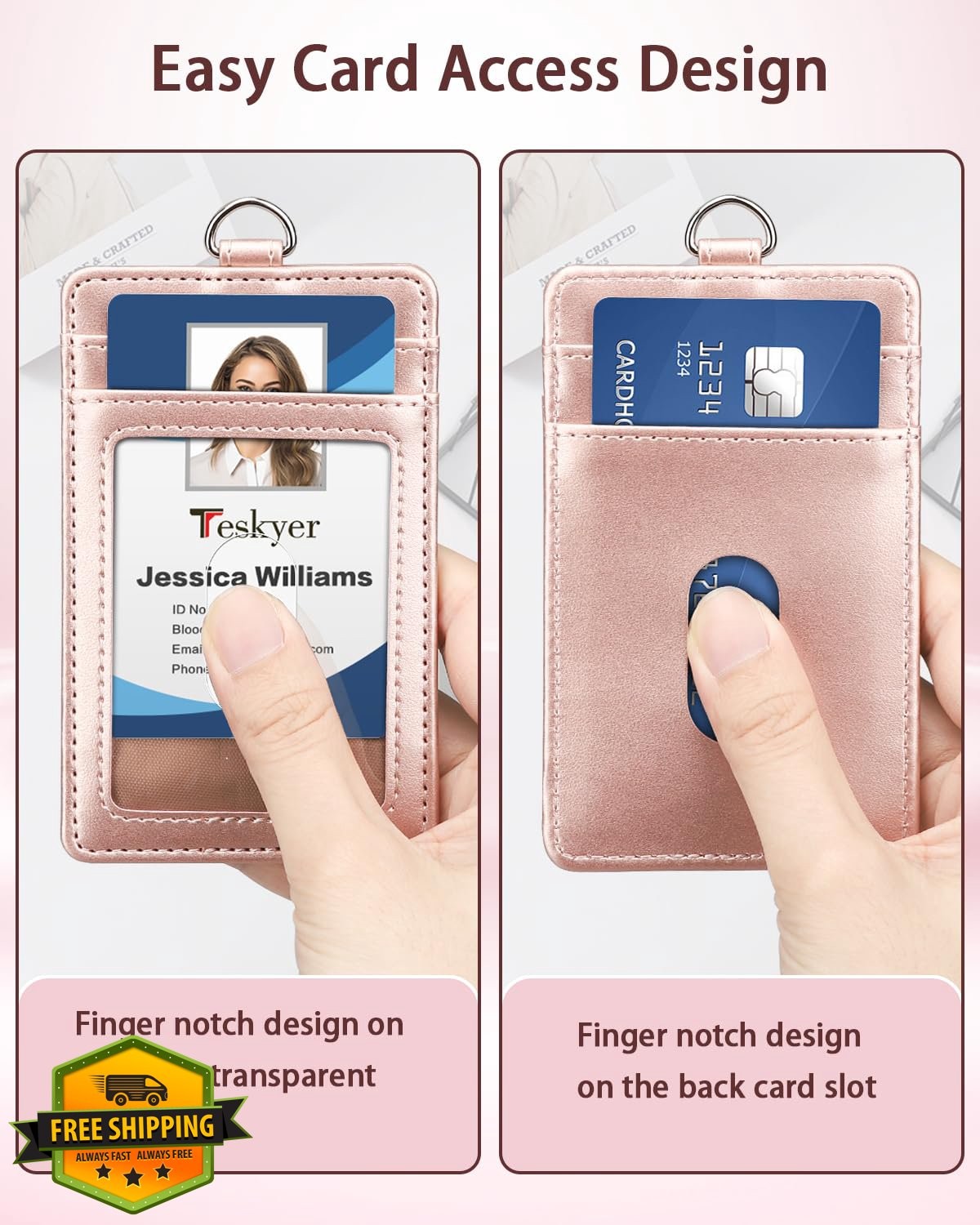 Teskyer Rose Gold PU Leather ID Badge Holder 4 Card Slots Lanyard