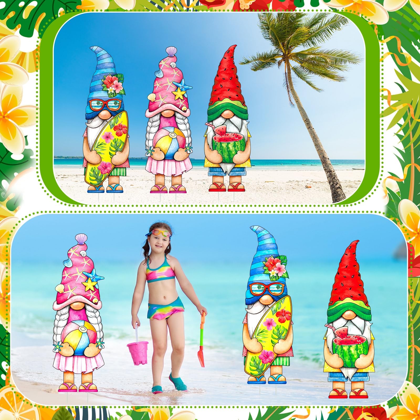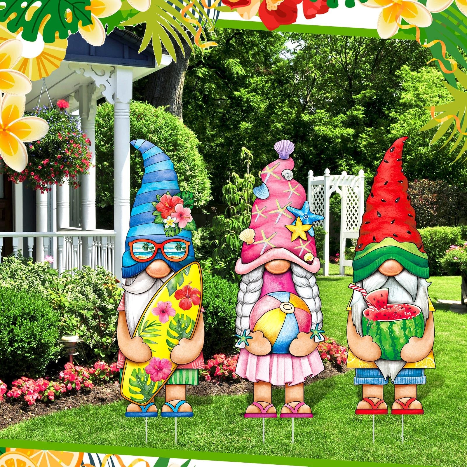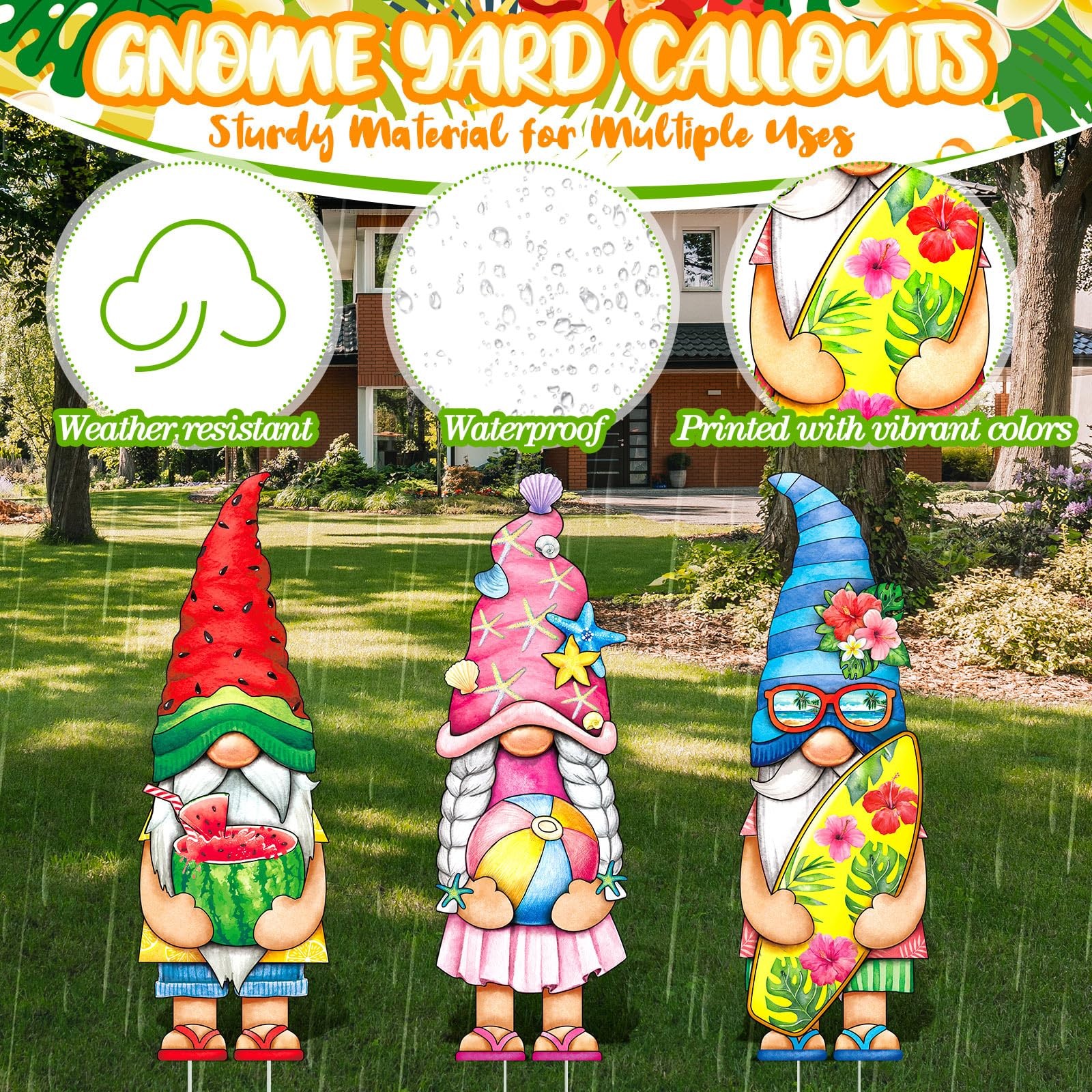 Included Components: 3 Summer-Themed Gnome Yard Signs With 2 Plastic Stakes Each