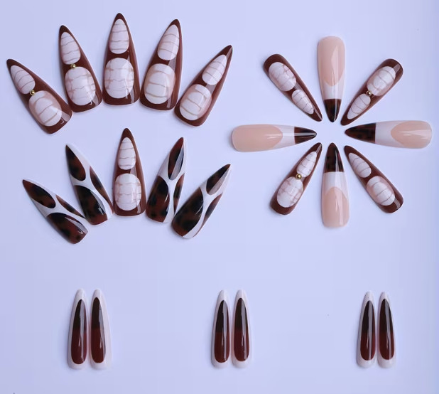 24 Pcs Press-on Nails Long Pointed Glossy - Brown White French Leopard Print