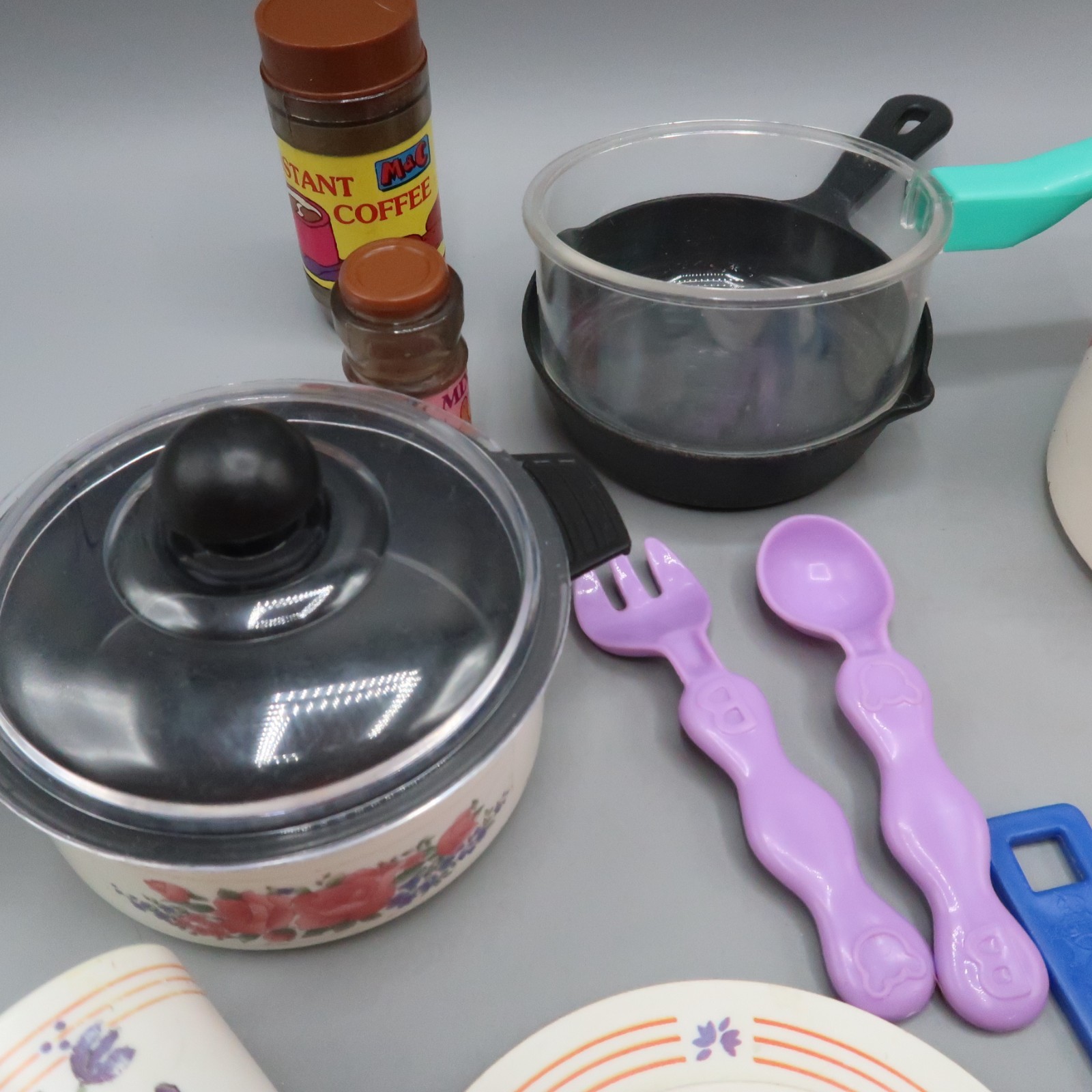 Play Kitchen Dishes Set Coffee Teapot Pots Pans Silverware Trays Toy Lot