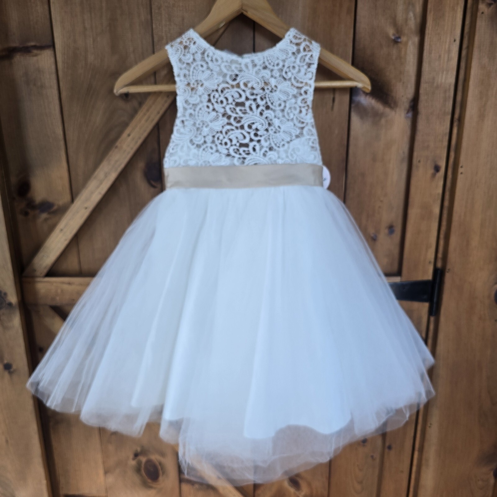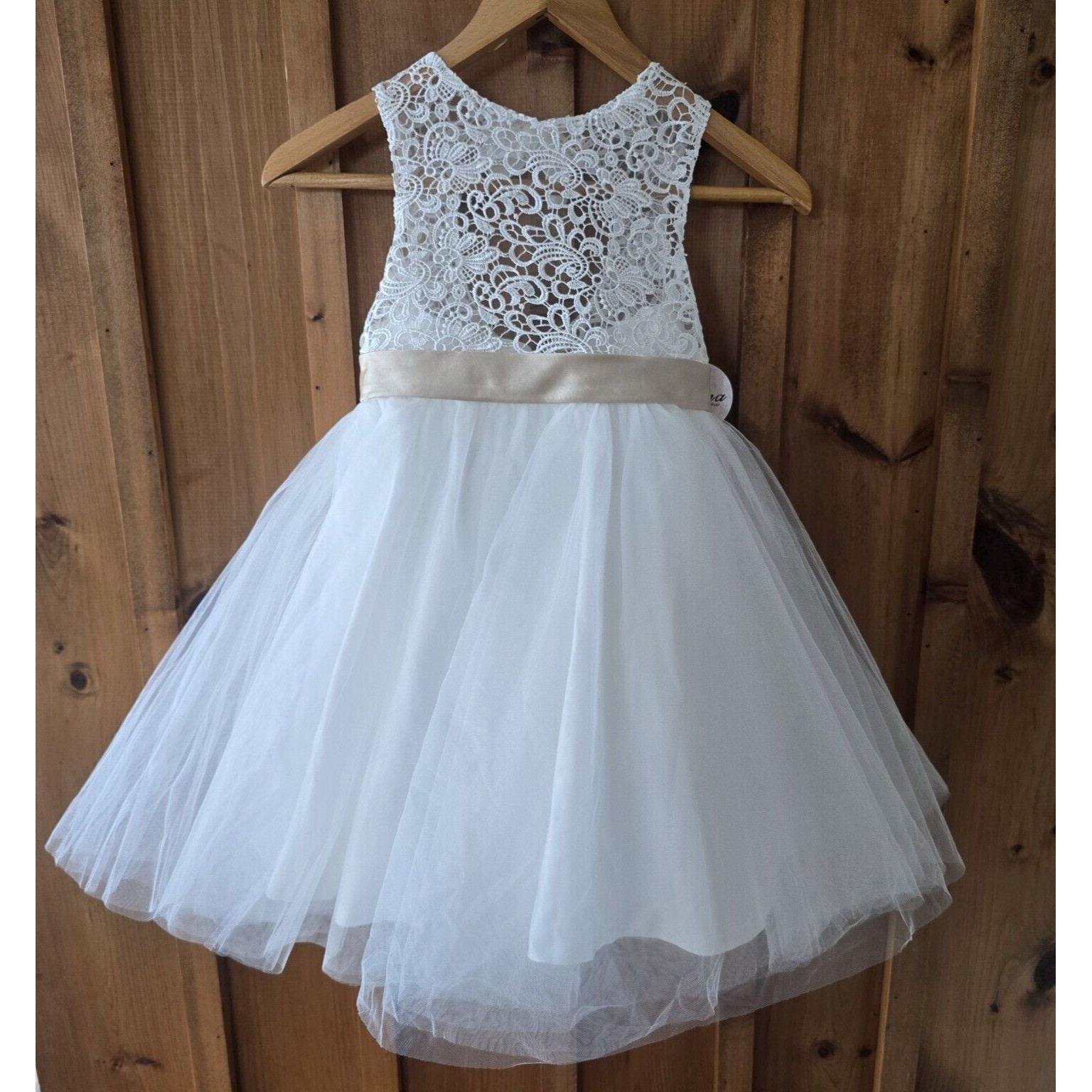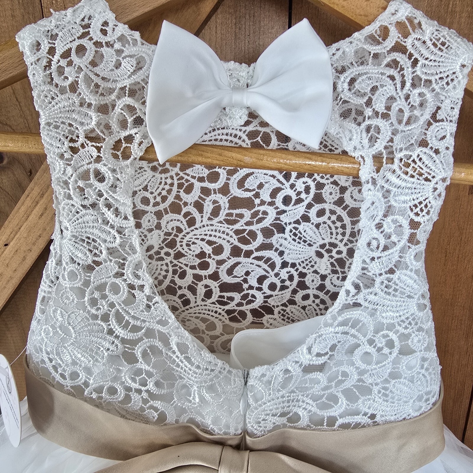 как выглядит Miama Lace Tulle Flower Girl Dress Kid Size 7 White Champagne Bow Wedding Formal фото