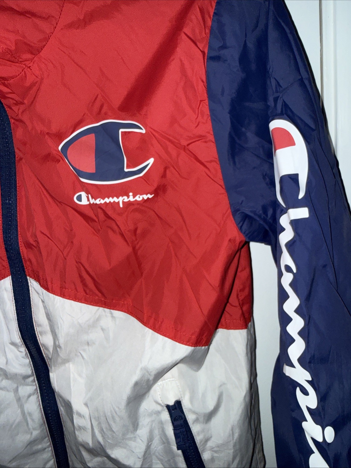 как выглядит Champion Kids Medium 10/12 Windbreaker Zip Jacket Hooded Lined Red White Blue фото