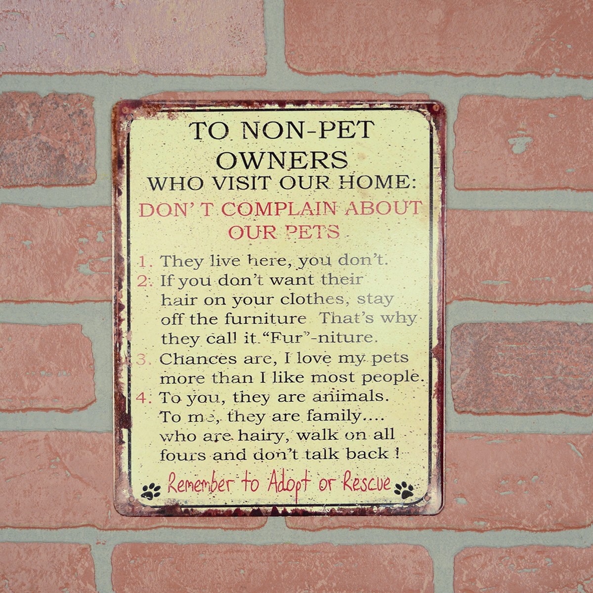 Funny Metal Non Pet Owners Home Rules Dog Cat Lover Sign Novelty Wall Door Decor