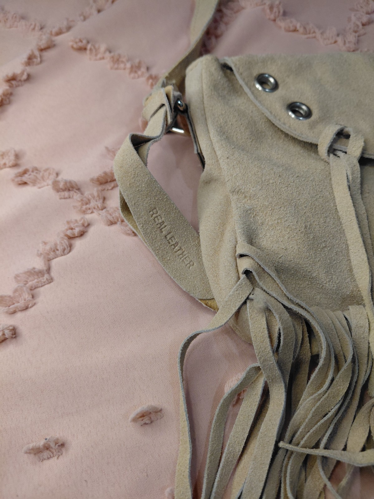 как выглядит Vintage Era Leather Shoulder Fringe Purse Hippy Boho Suede. Beige Exterior фото