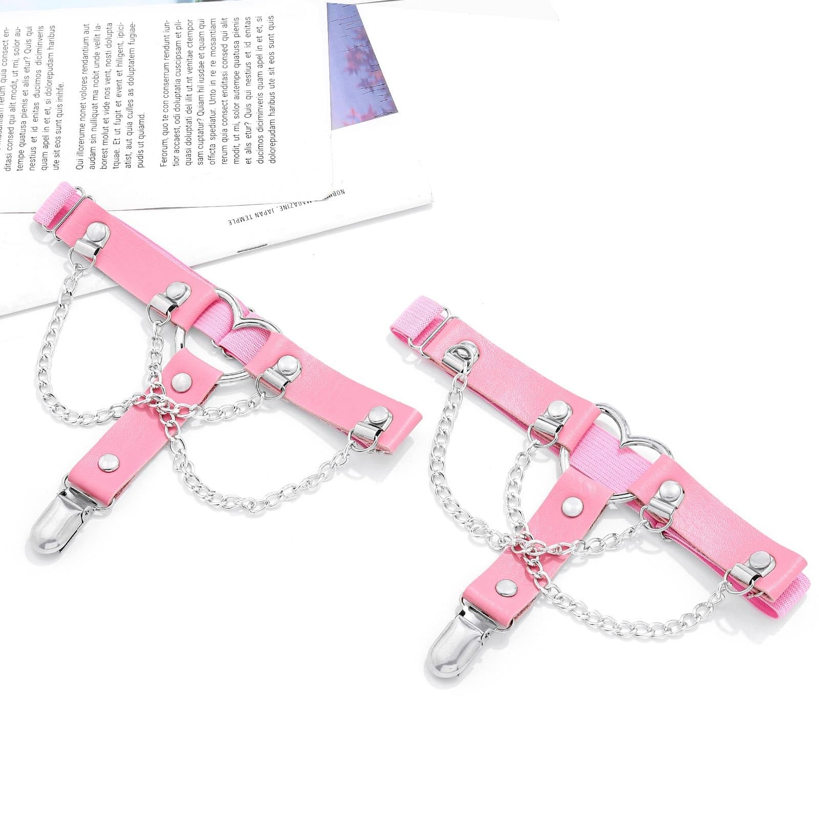 Pink Leather Garter Belt with Heart Rings and Chains, Adjustable Thigh Straps...