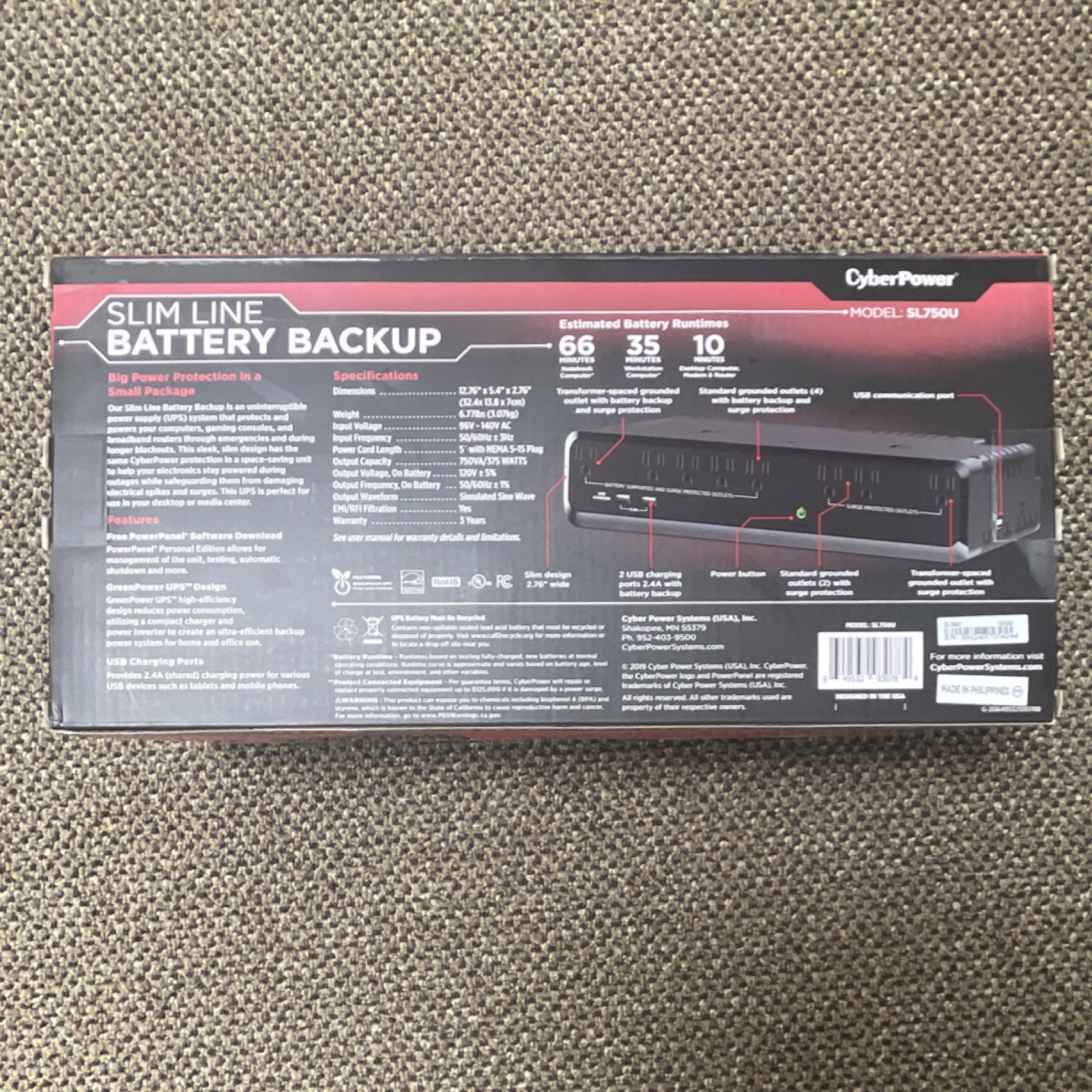 CyberPower SL750U Battery Backup UPS 750VA 375W Surge Protection USB 8 Outlets
