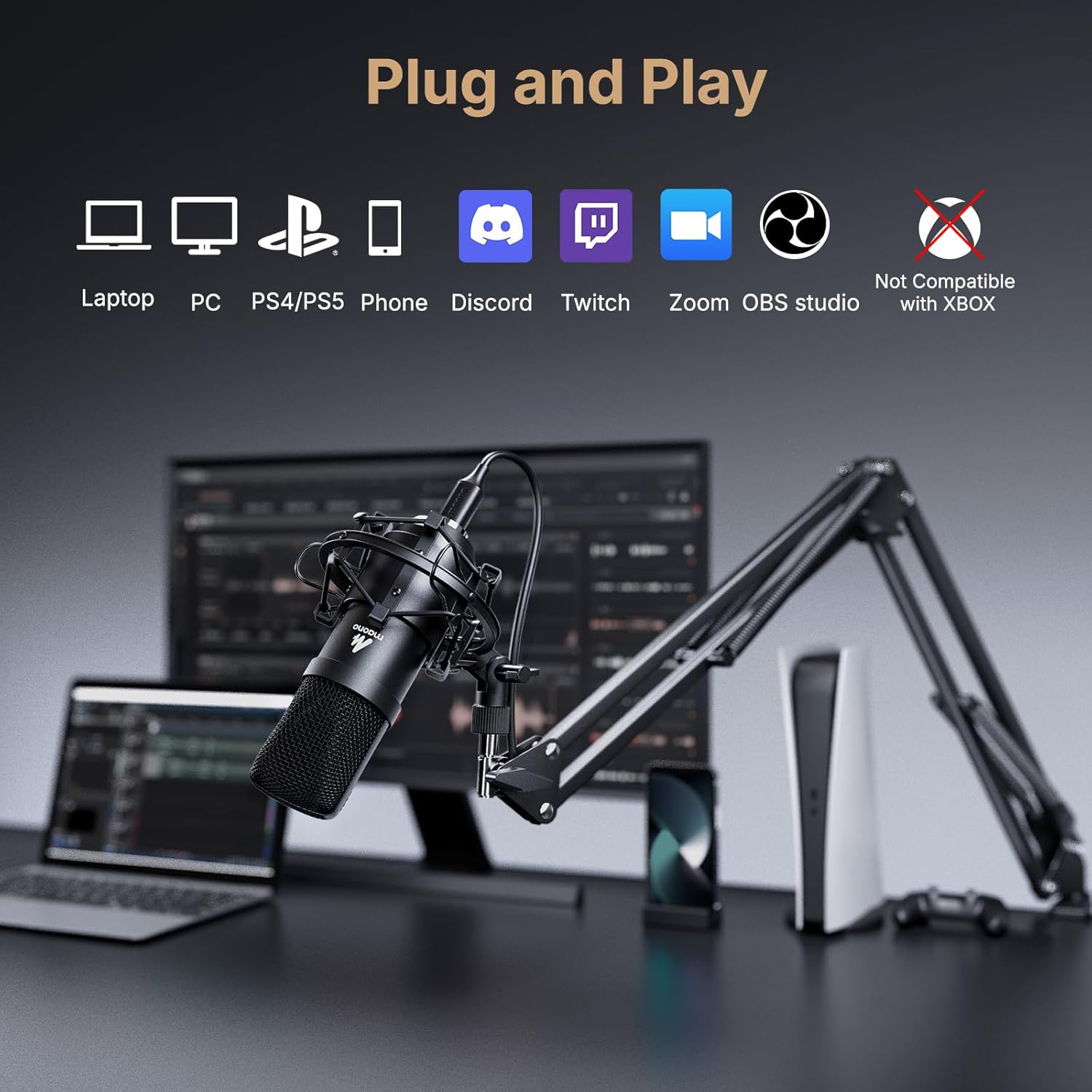 USB Microphone, 192Khz/24Bit Plug Play PC Computer Podcast Condenser Cardioid