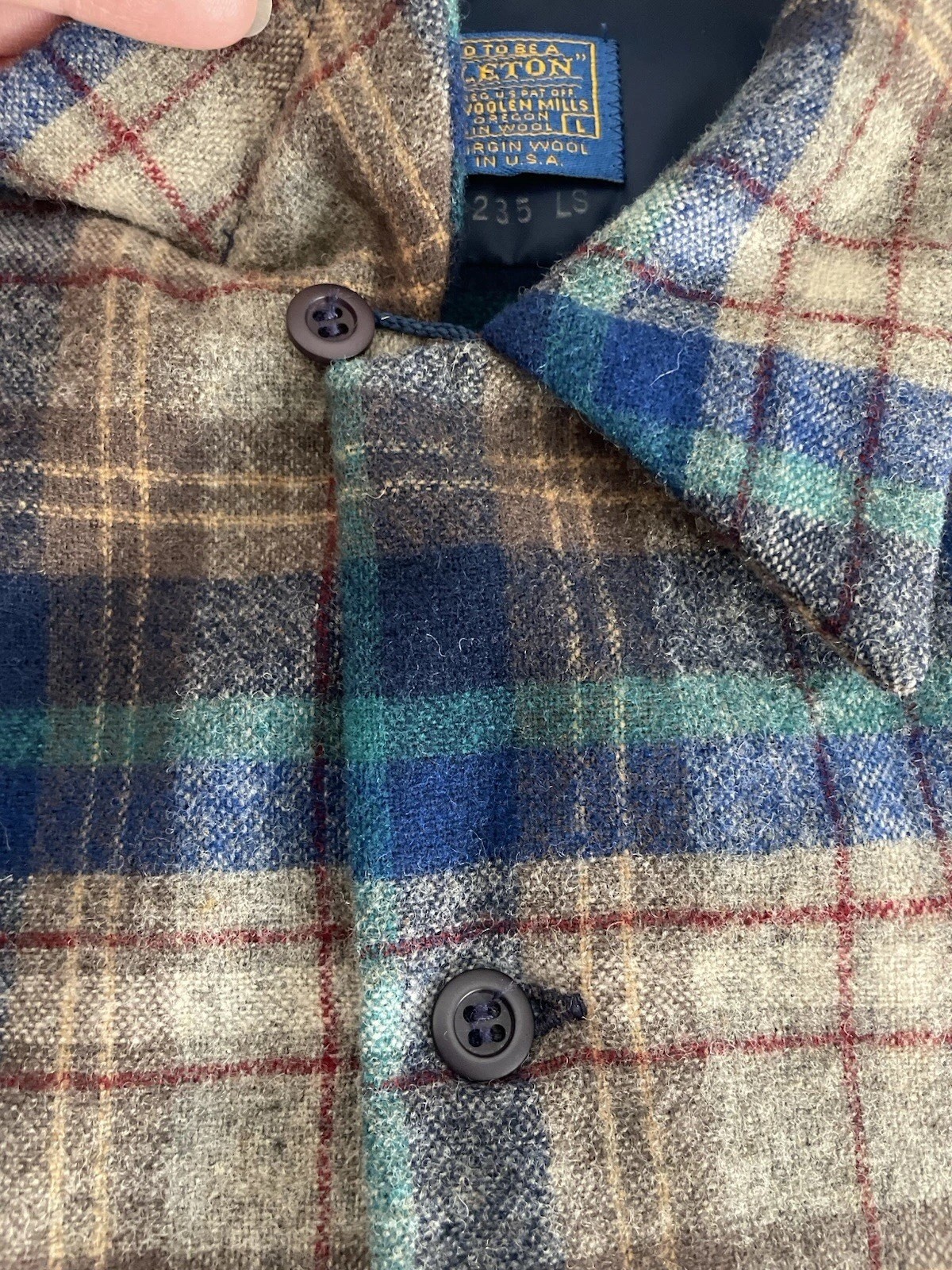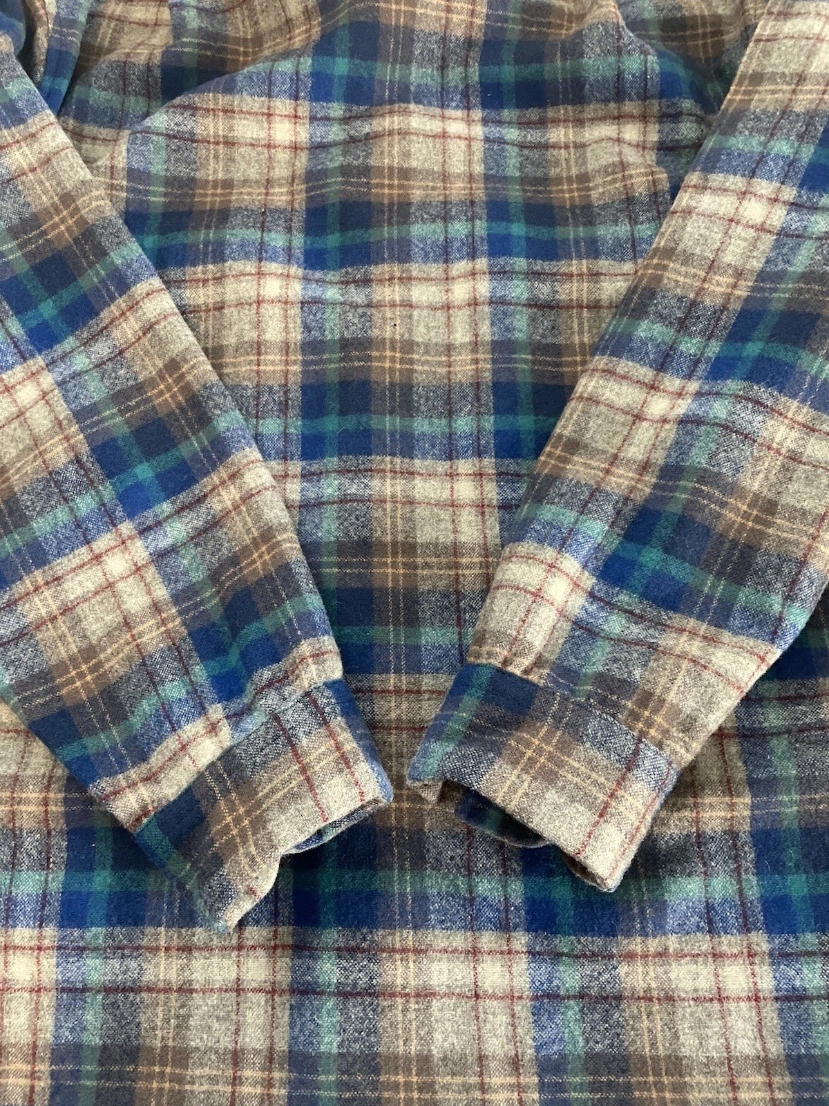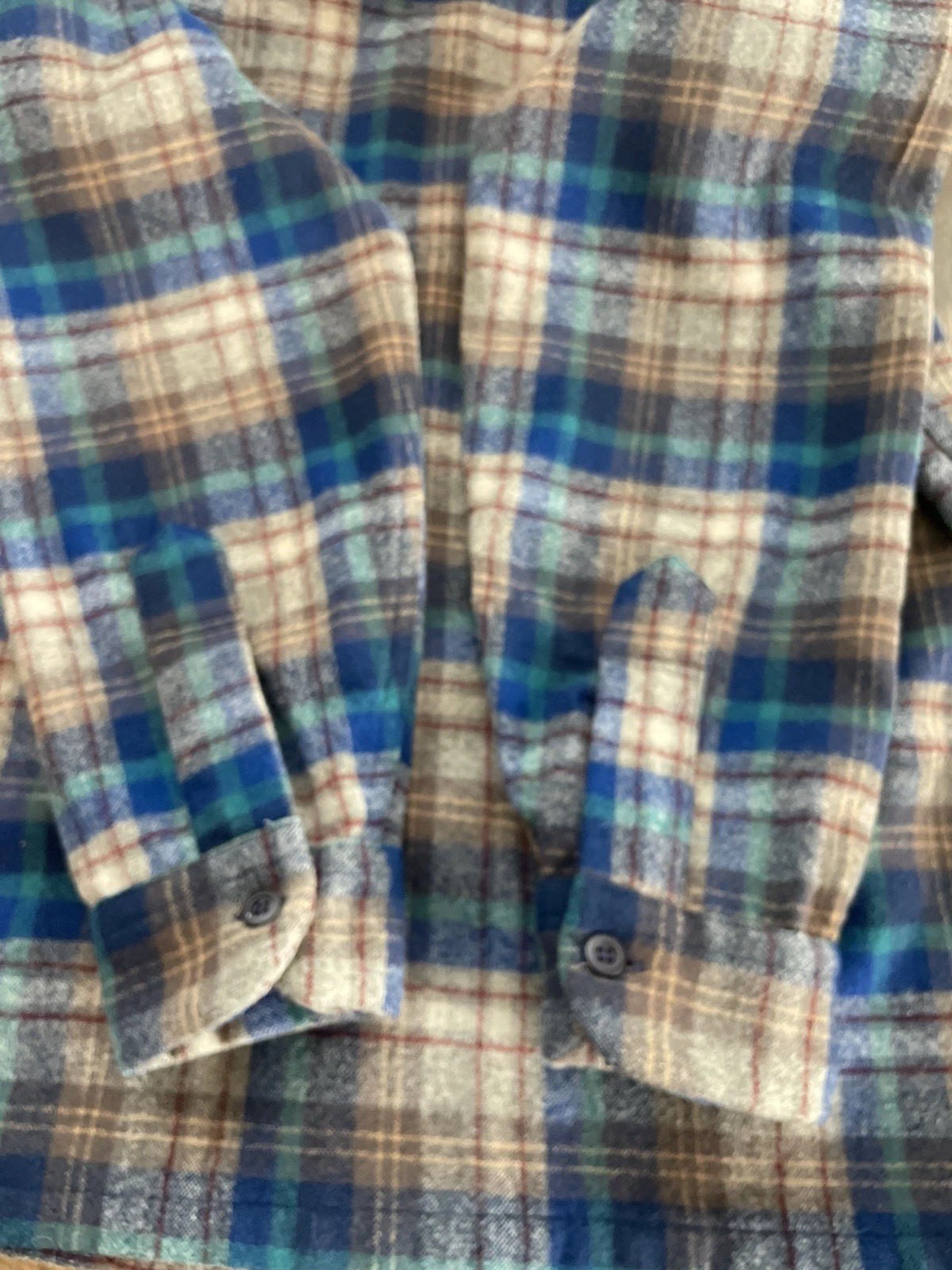 как выглядит Vintage Pendleton Wool Board Shirt USA 60-70 s Blue Tan Teal Plaid Men s L Flaw фото