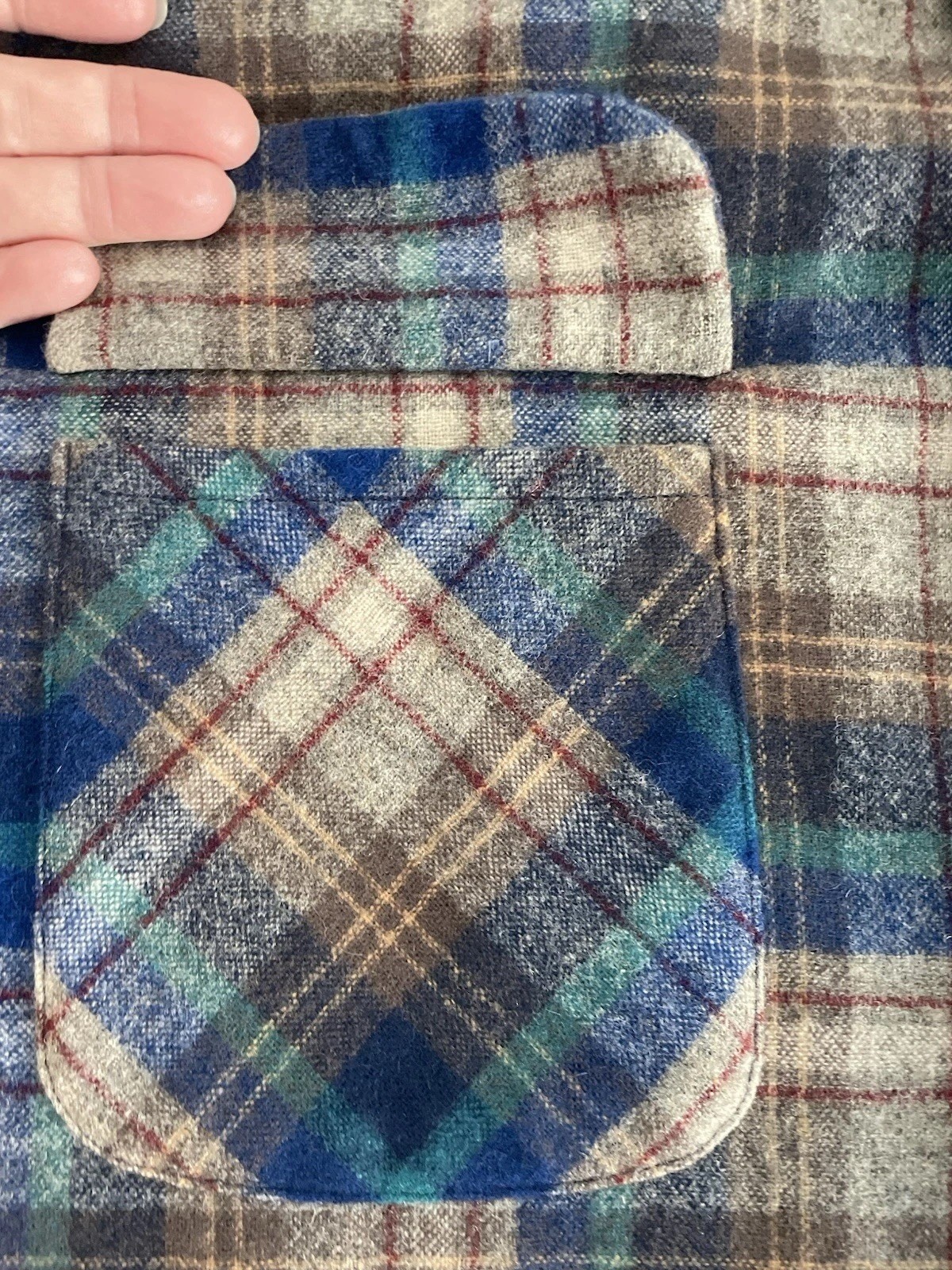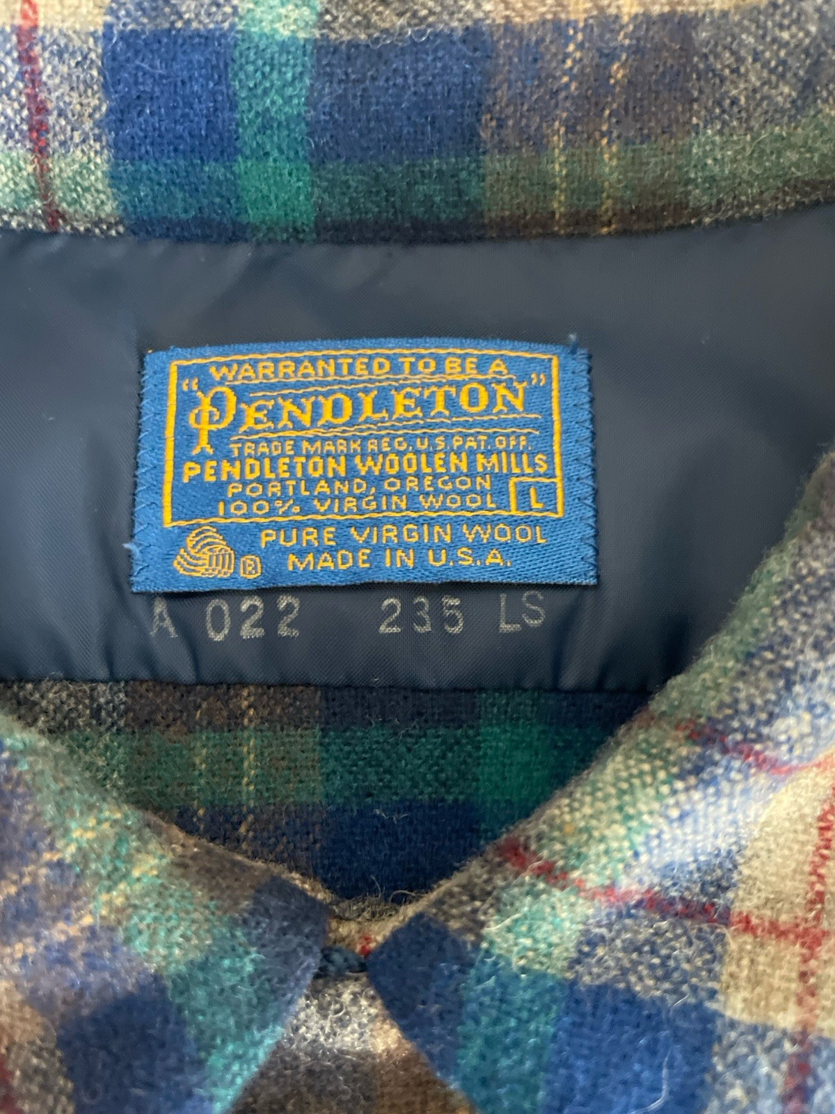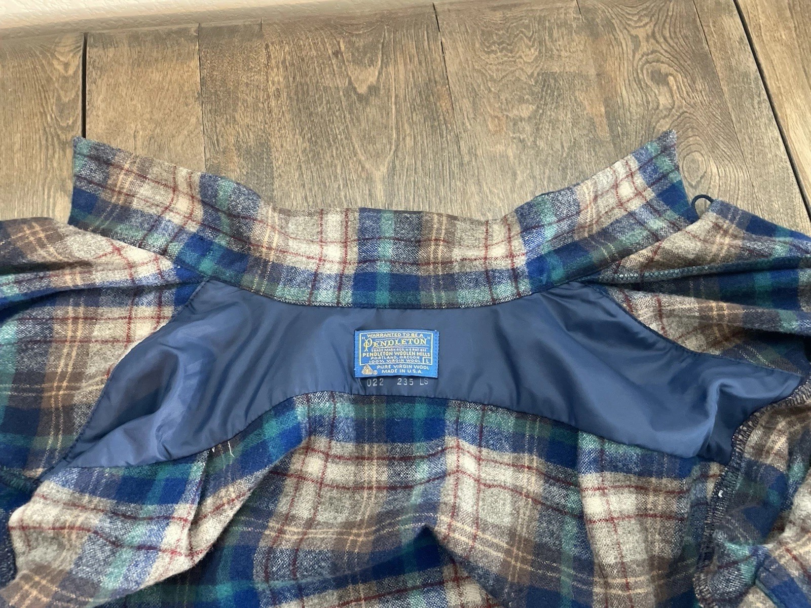 как выглядит Vintage Pendleton Wool Board Shirt USA 60-70 s Blue Tan Teal Plaid Men s L Flaw фото