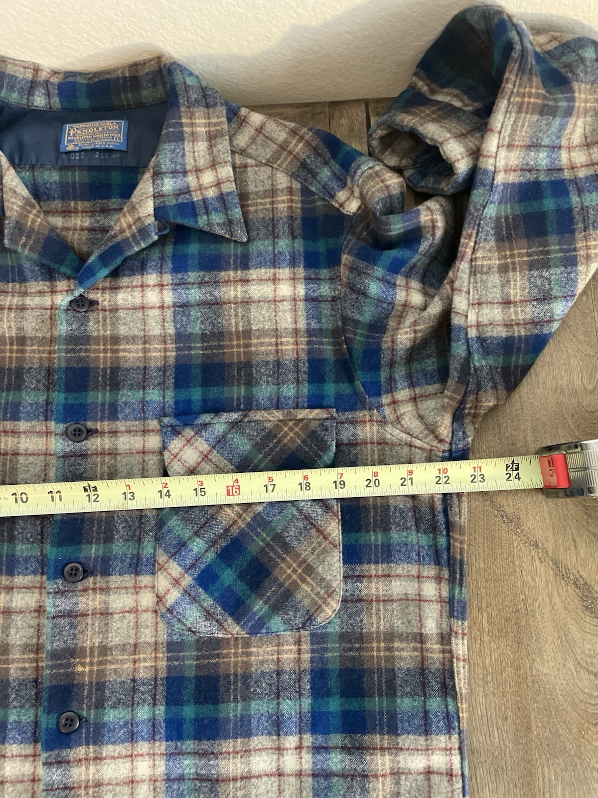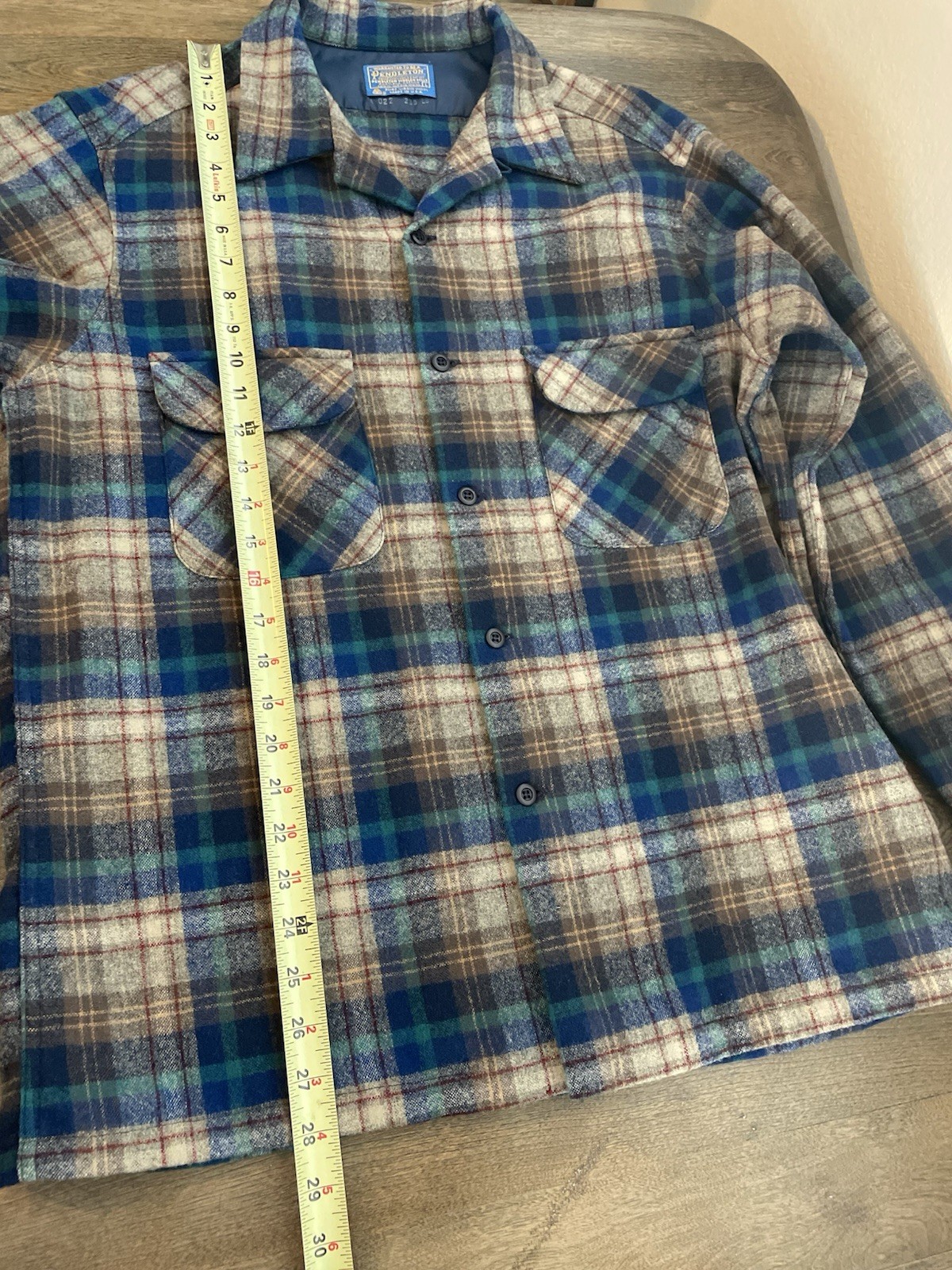 Vintage Pendleton Wool Board Shirt USA 60-70 s Blue Tan Teal Plaid Men s L Flaw