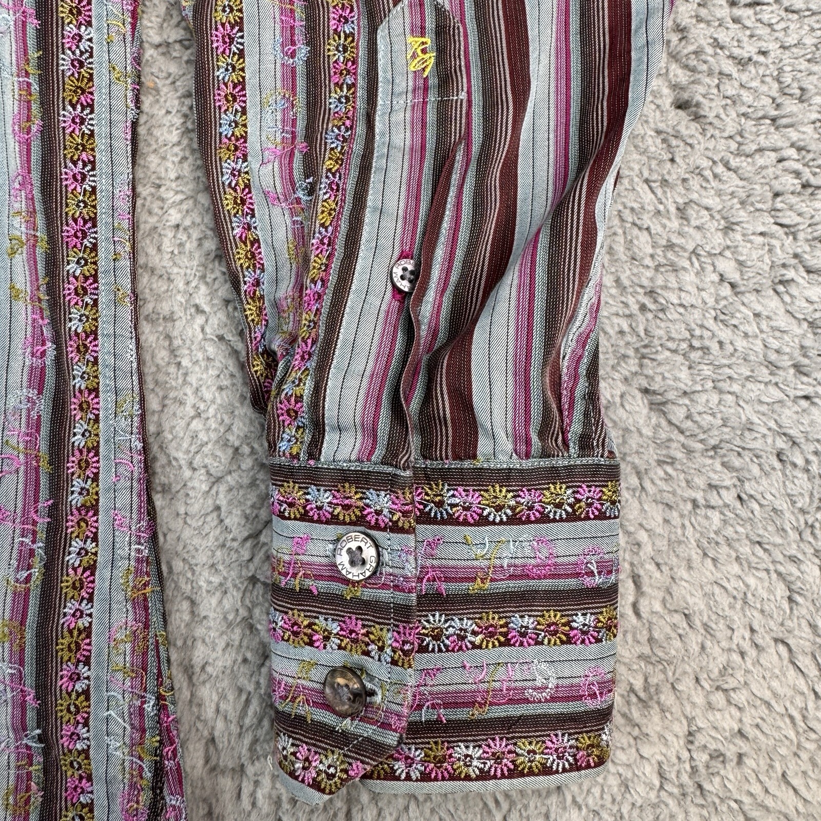 как выглядит Robert Graham Shirt Men s M Multicolor Stripe Floral Embroidered Flip Cuff фото
