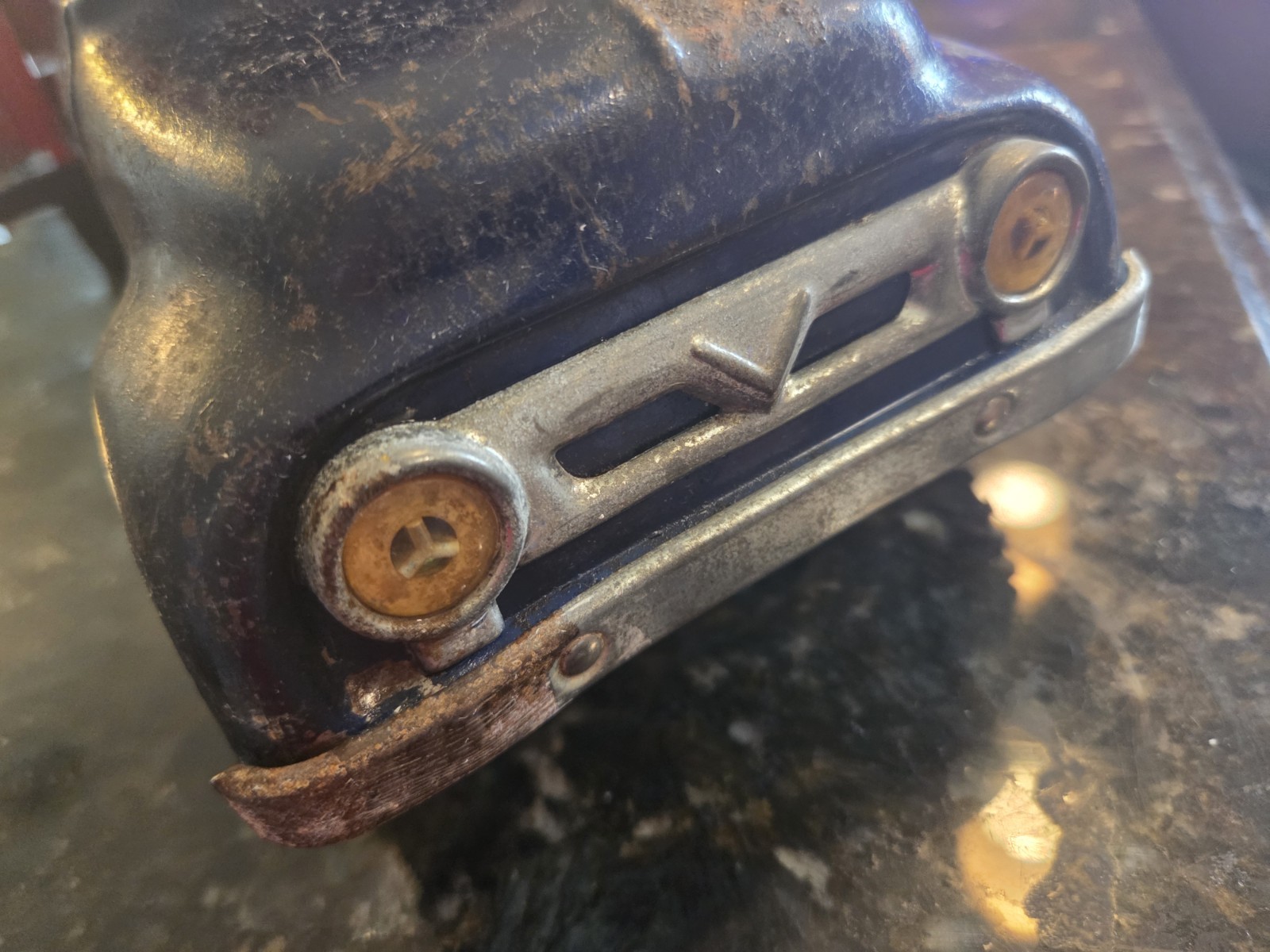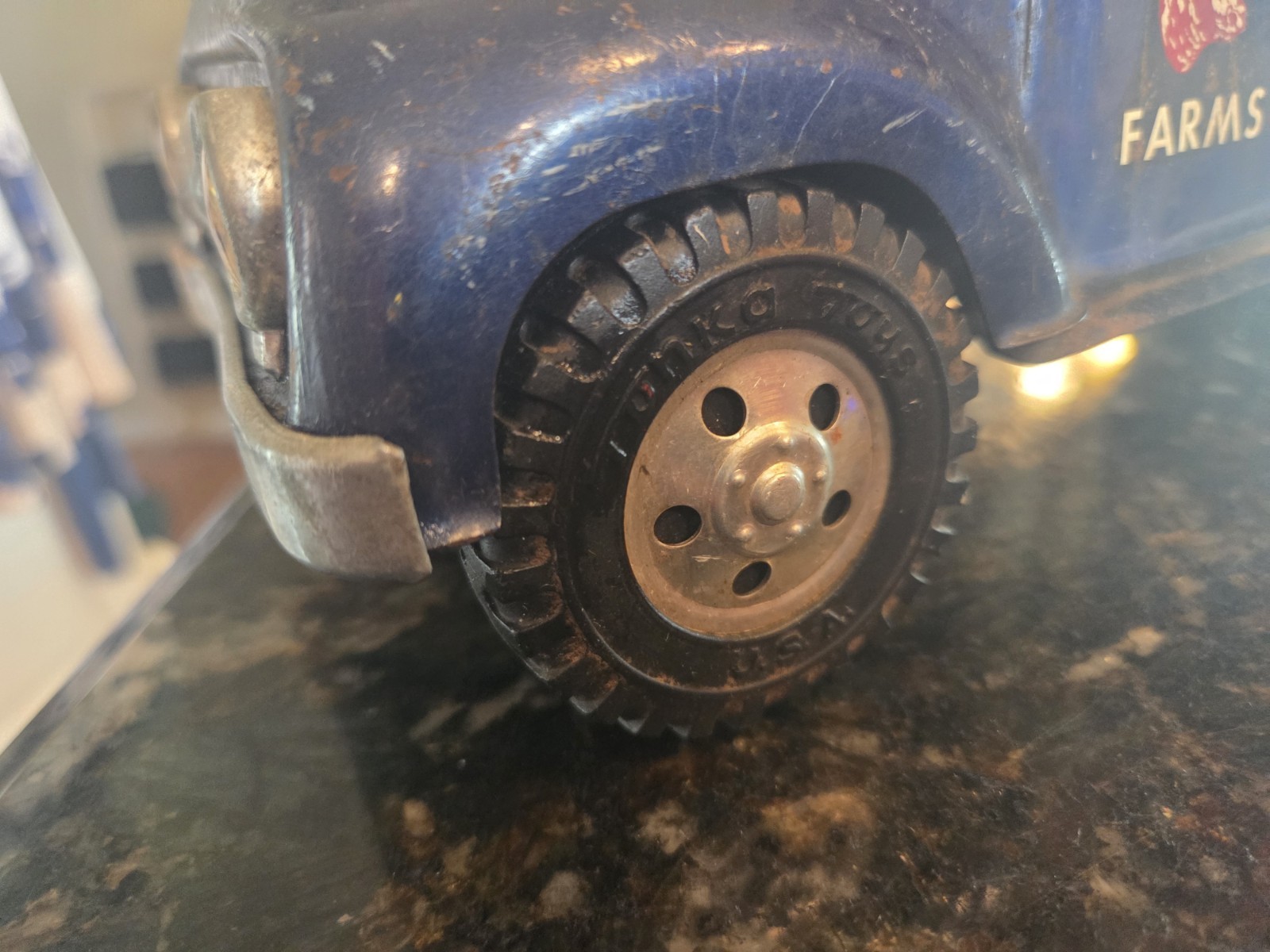 как выглядит VINTAGE 1957 TONKA FARMS BLUE RED STAKE TRUCK 404 W/ CATTLE фото