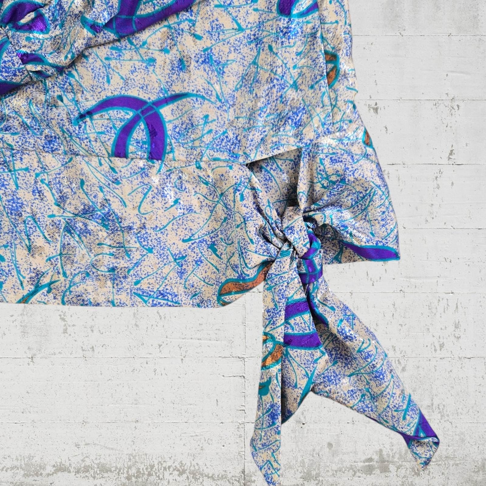 как выглядит 70s Vintage Cream Blue Metallic Abstract USA Made Blouse Midi Skirt Set Size 14 фото