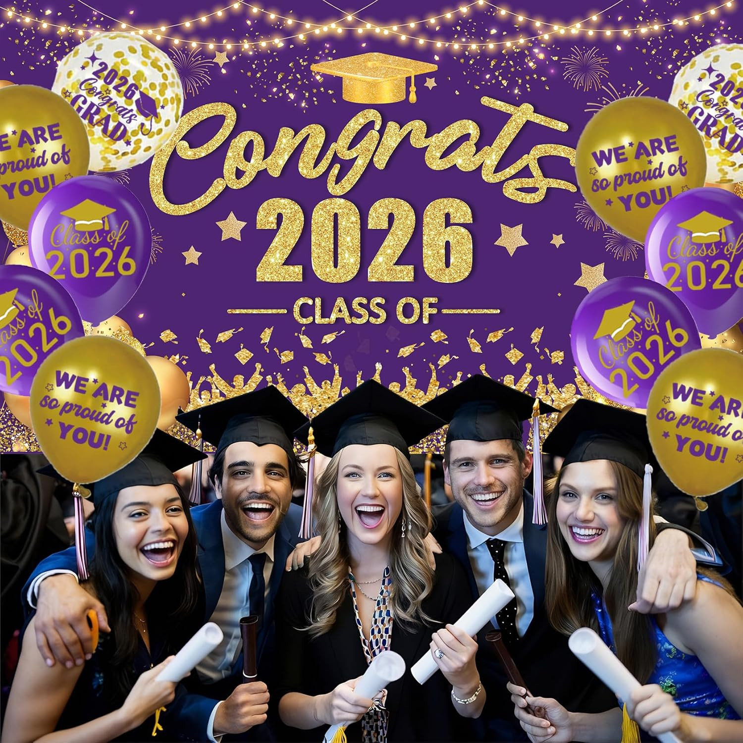 как выглядит Purple and Gold Graduation Decorations Class of 2026 Banner with 18 Pcs Grad Bal фото