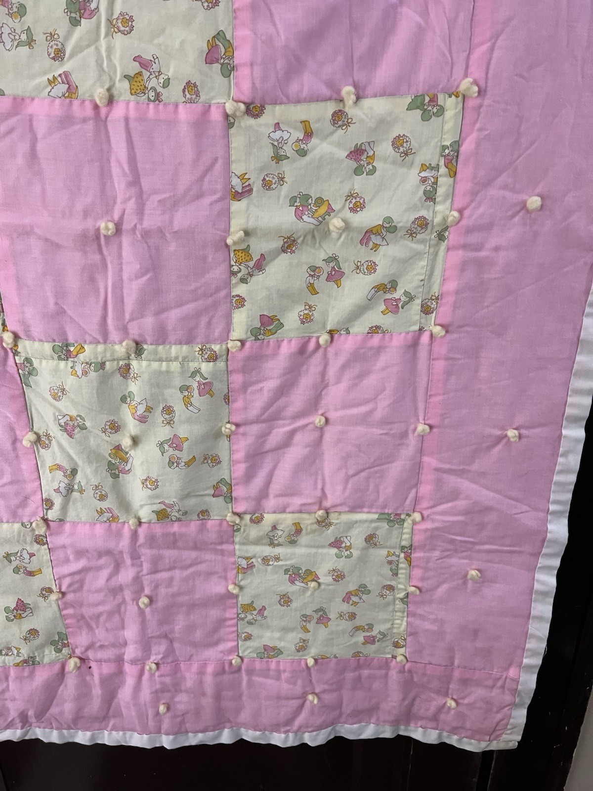 как выглядит VTG Handcrafted Baby Crib Quilt Nursery Pink Large Check Pom Pom 35x38 READ фото