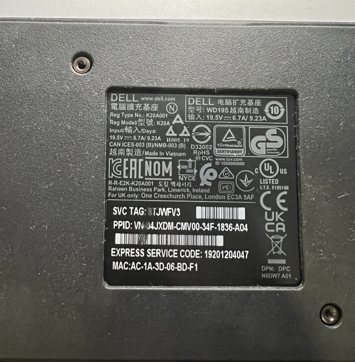 Dell WD19S K20A001 USB-C Docking Station Fully Tested Working No AC Adapter
