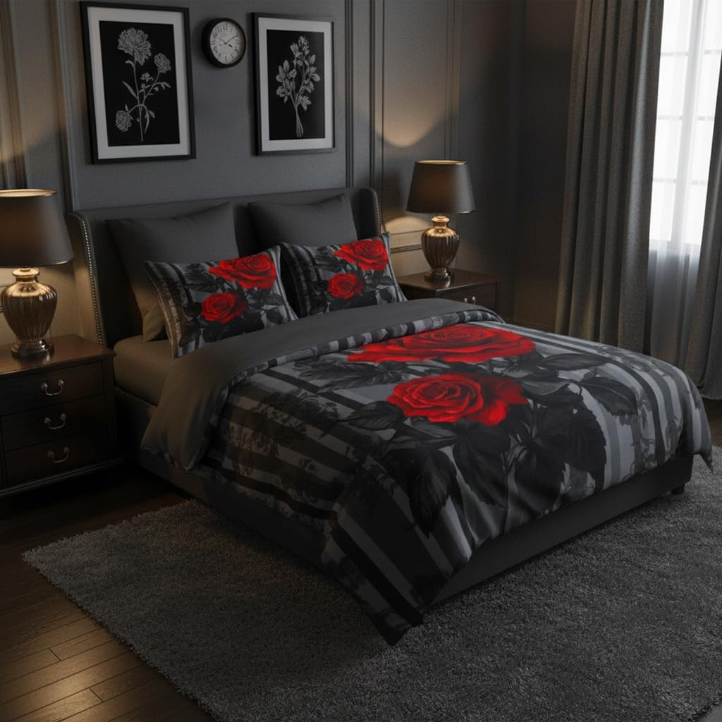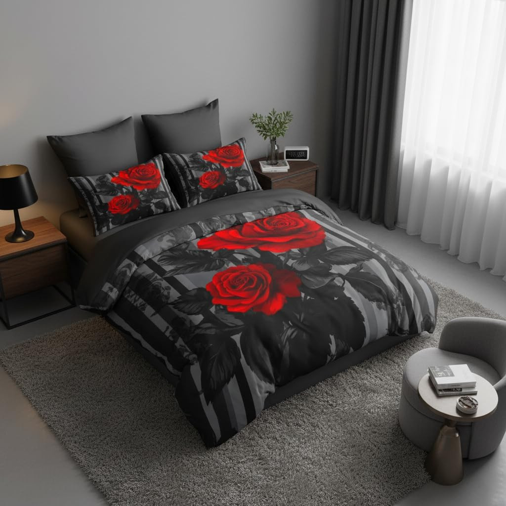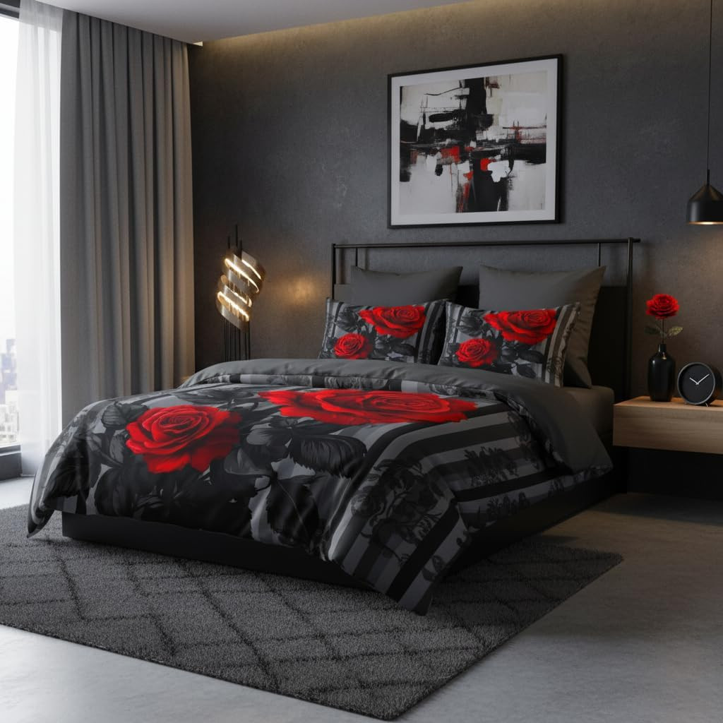 Black Red Comforter Set King Size Women Red Rose Bedding Set with Black Grey Str