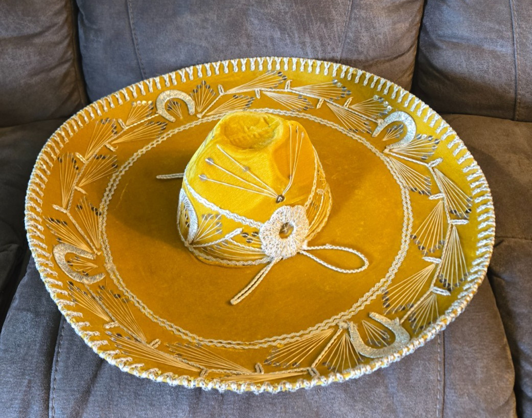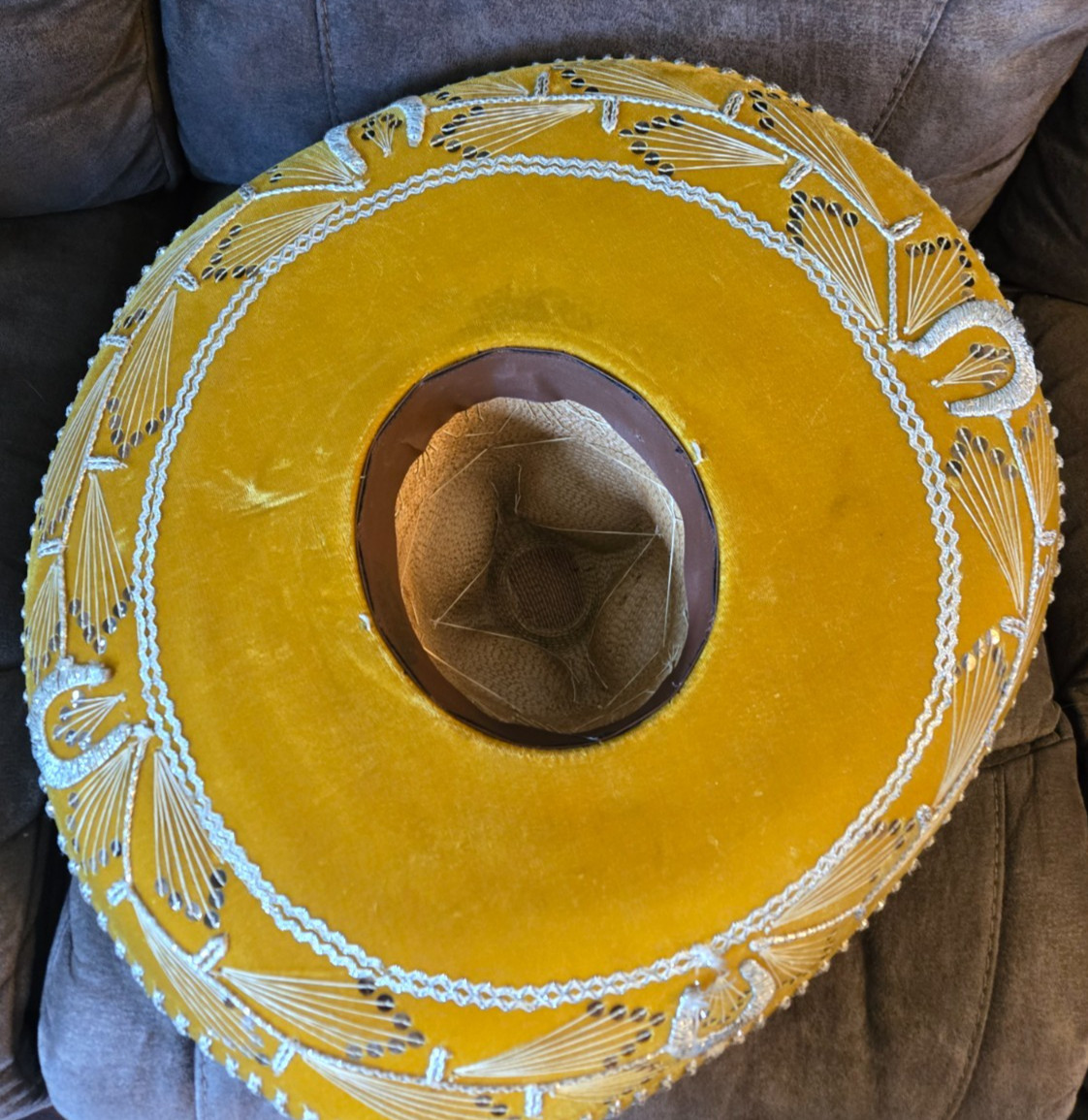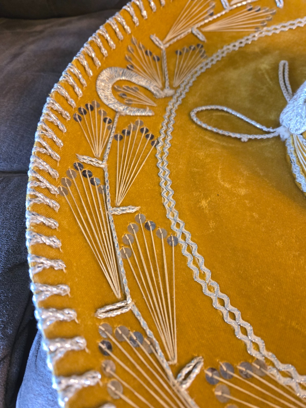 • Vintage 1970's Authentic Mexican Sombrero Gold with Gold Thread 22" diameter