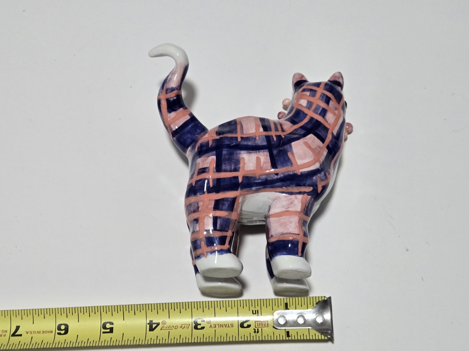 • Whimsiclay Fancy Felines Lacombe 2002 Cat Figure Pink, Blue Plaid OOP No.21022