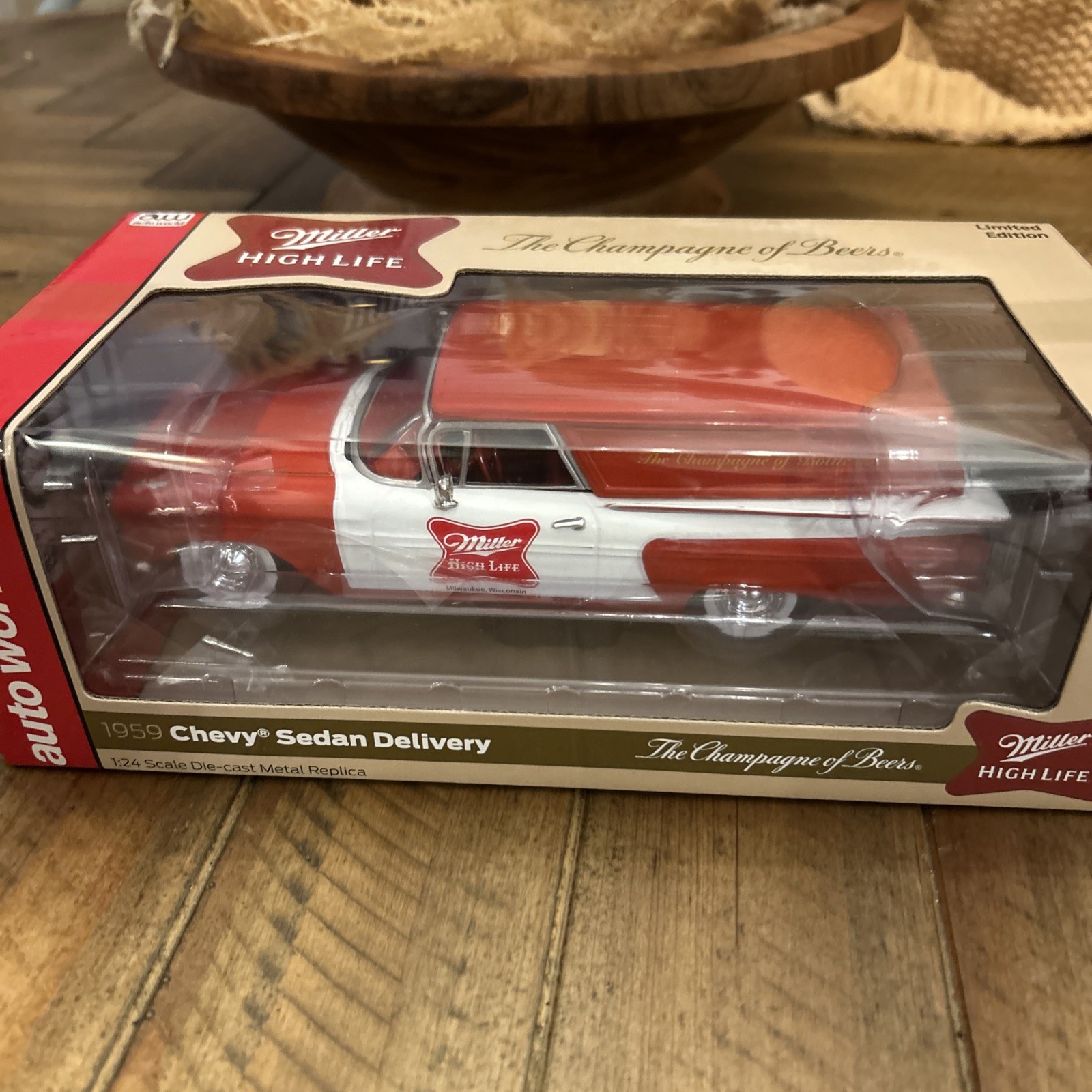 NIB Auto World 1959 CHEVY SEDAN Miller High Life Delivery Truck 1:24 Die-Cast