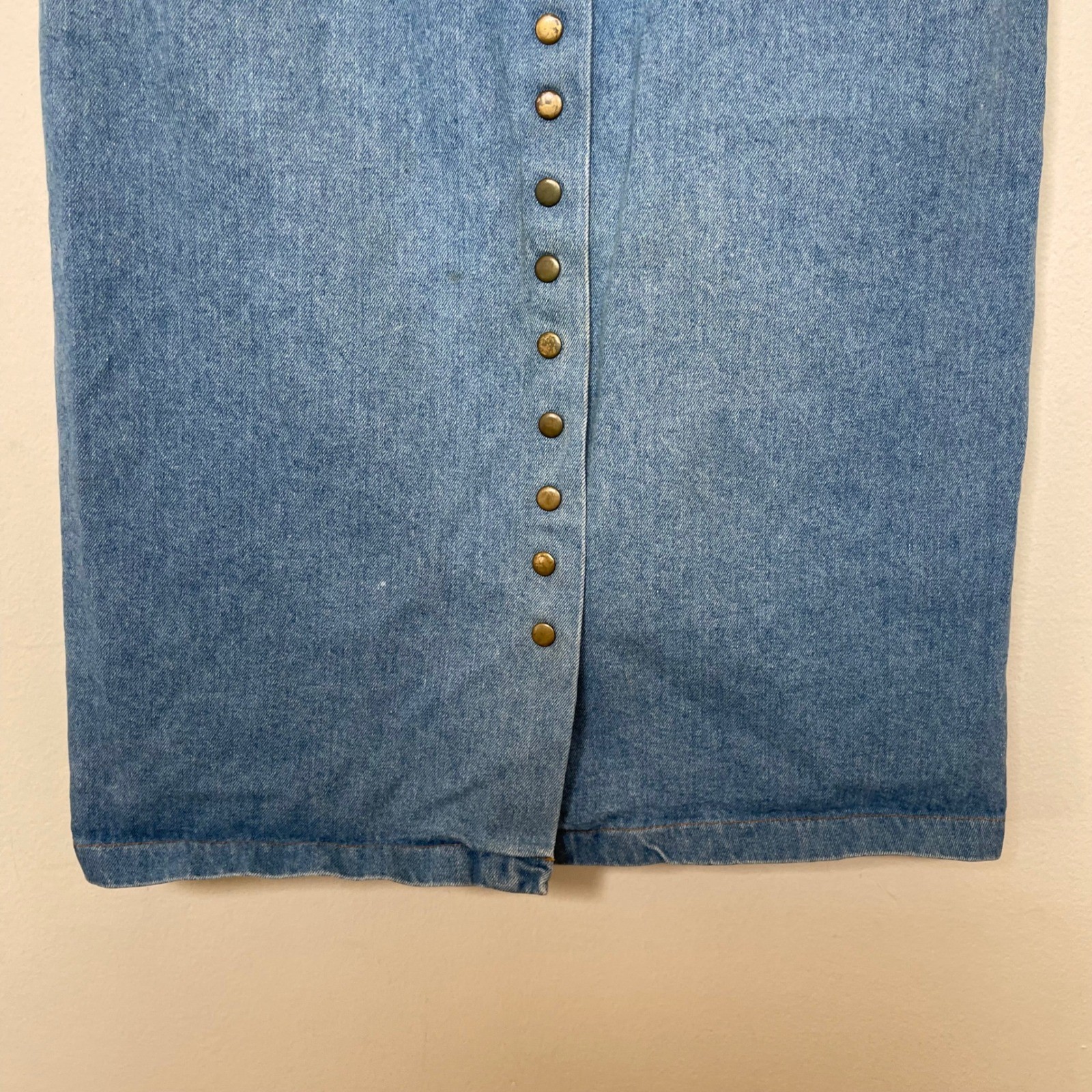 Vintage High Waisted Button Front Denim Midi Skirt 10 Light Wash Blue 80s 90s