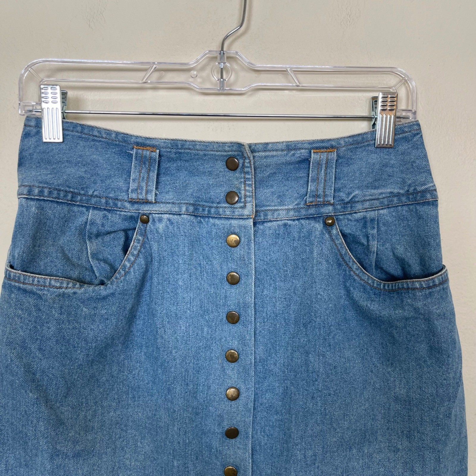 как выглядит Vintage High Waisted Button Front Denim Midi Skirt 10 Light Wash Blue 80s 90s фото