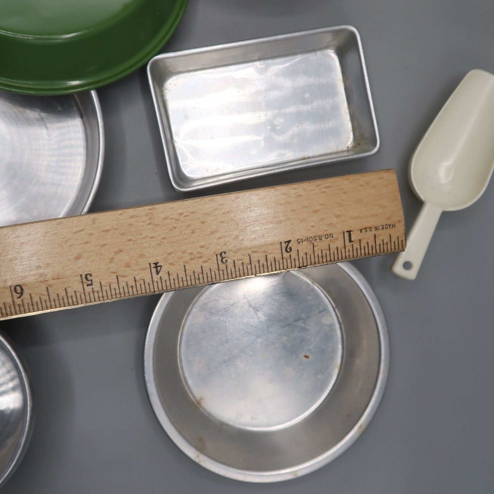 как выглядит Vintage Aluminum Metal Childs Kitchen Play Set Pots Pans Bakeware фото