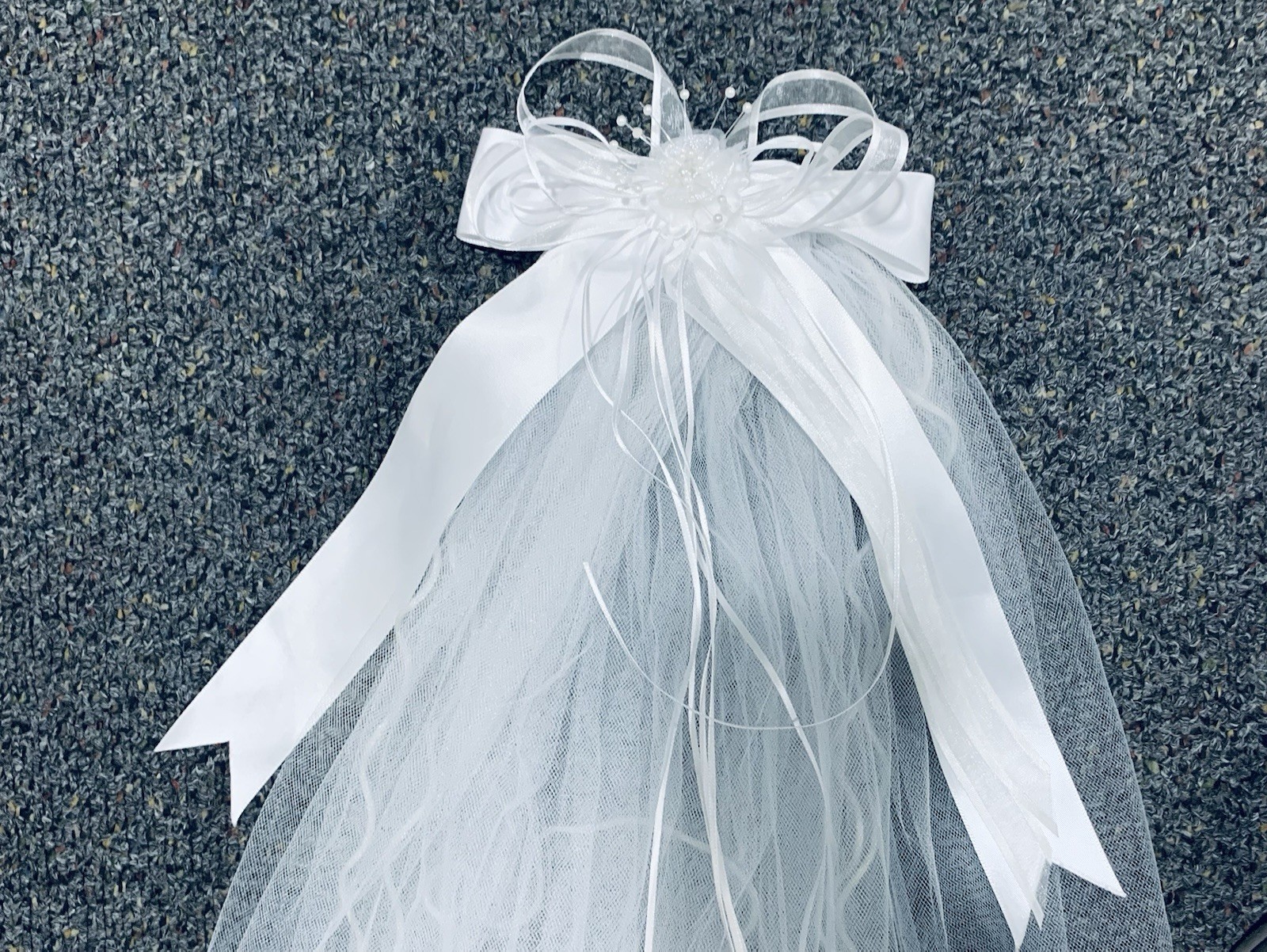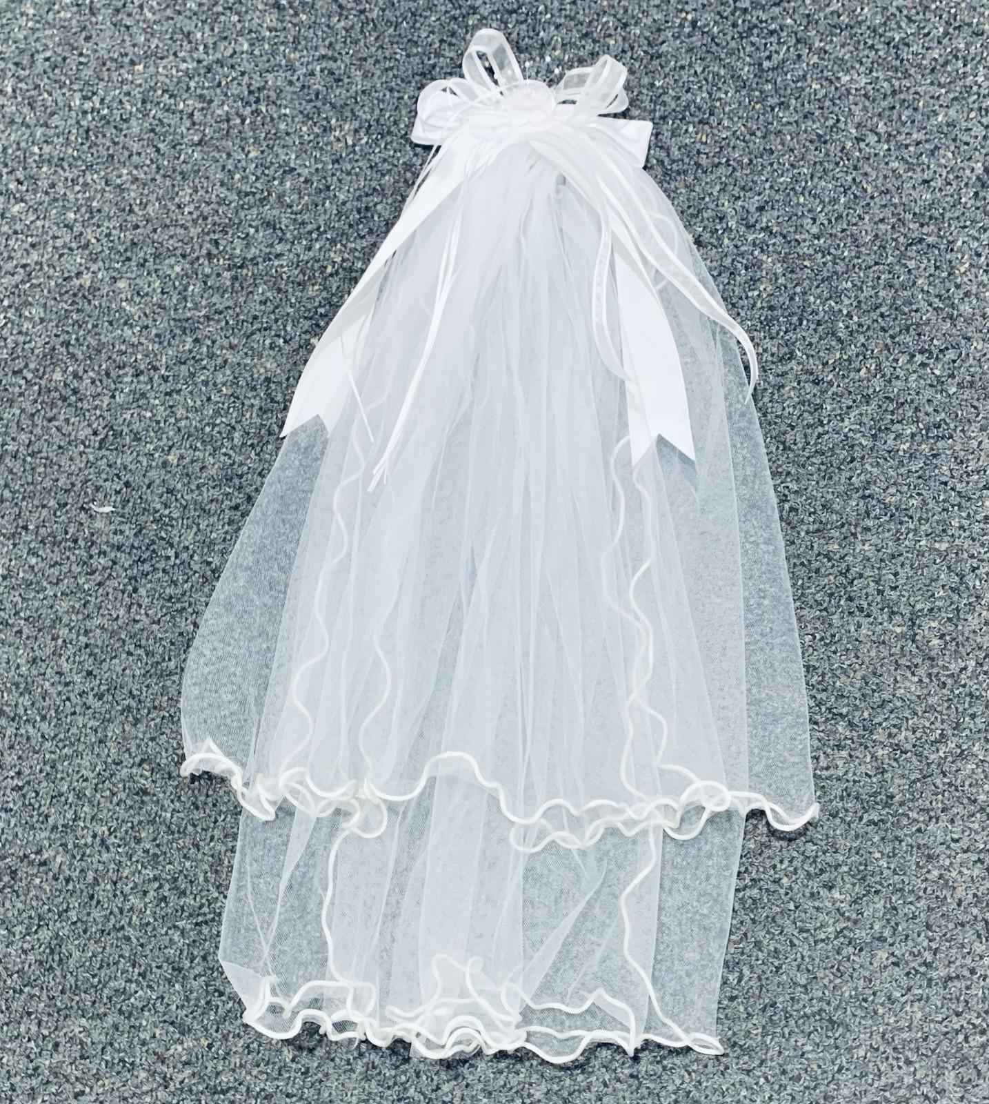 First Communion White Veil With Satin Ribbon, Pearls And Barrette