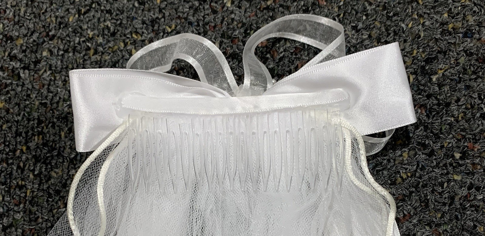 как выглядит First Communion White Veil With Satin Ribbon, Pearls And Barrette фото